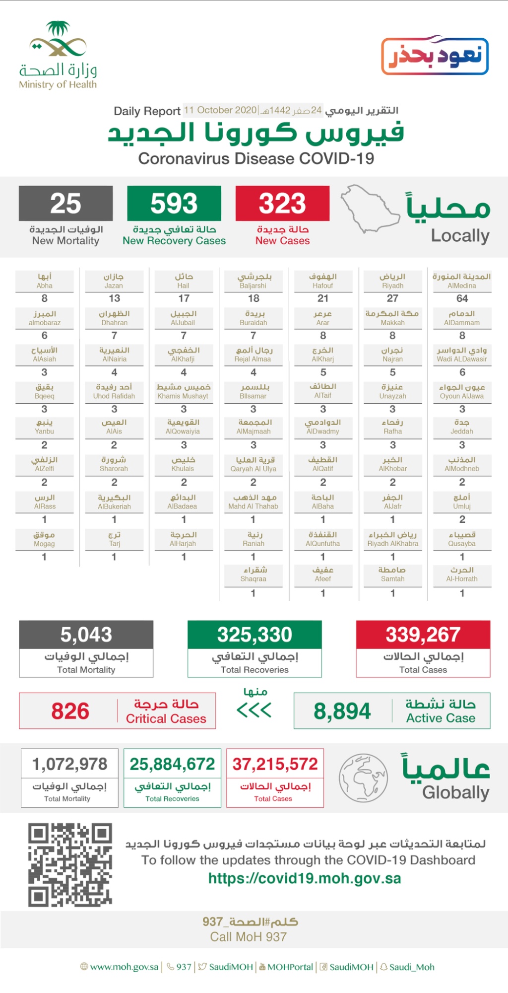 وأبان أنه تم تسجيل 593 حالة تعافٍ جديدة، ليصل إجمالي عدد المتعافين إلى 325330 حالة .