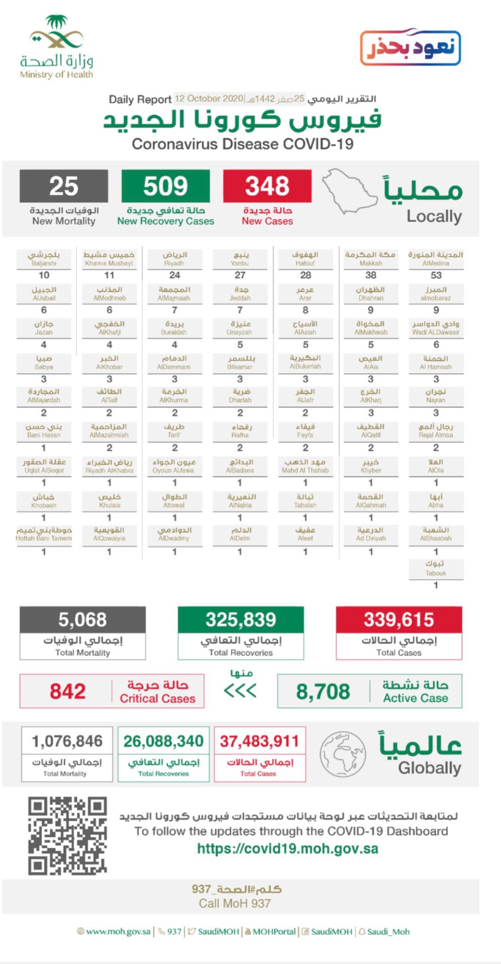 ولمعرفة تفاصيل إجمالي توزيع حالات الإصابة والتعافي، يمكن زيارة الموقع الإلكتروني المخصص من وزارة الصحة للاطلاع على مستجدات الفايروس في المملكة، والإحصاءات اليومية عبر الرابط https://covid19.moh.gov.sa/