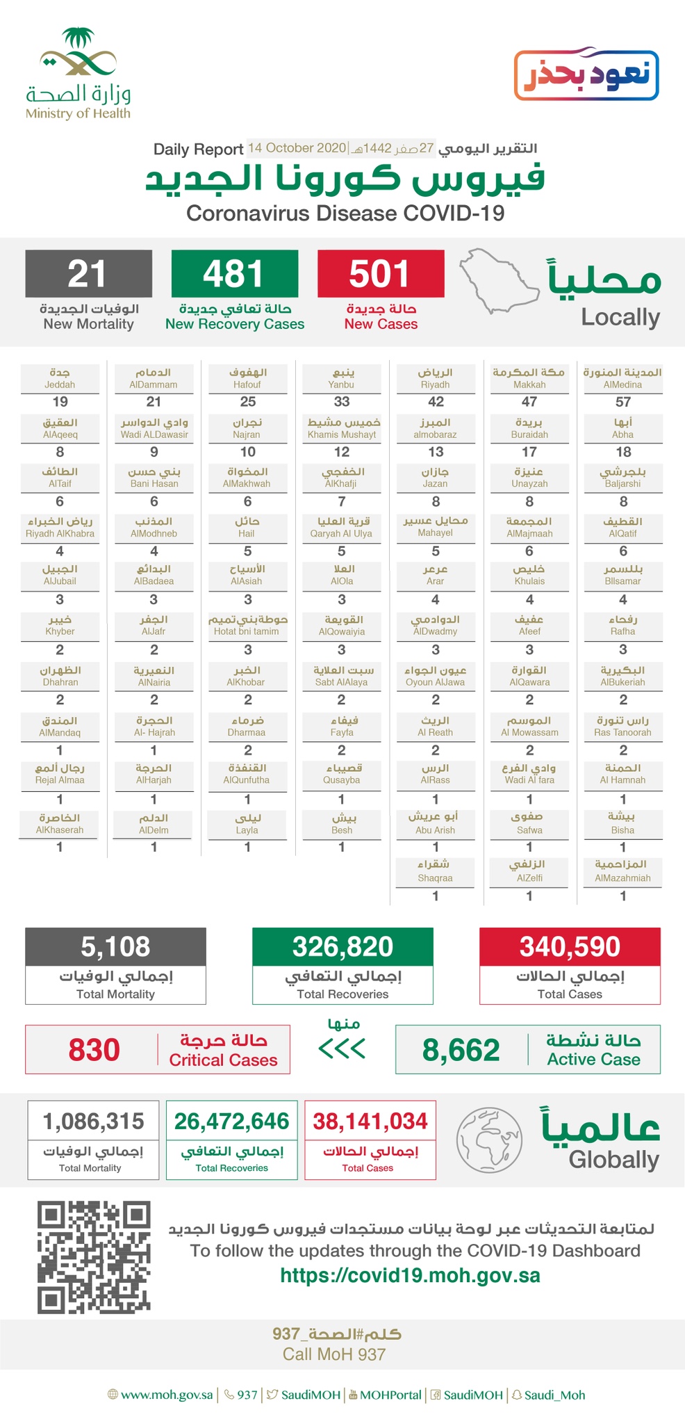 وتم تسجيل 481 حالة تعافٍ جديدة منها 8 بالقطيف وحالة واحدة بصفوى، لترتفع الحالات الإجمالية للتعافي إلى 326820 حالة، (96% من إجمالي الإصابات المسجلة).