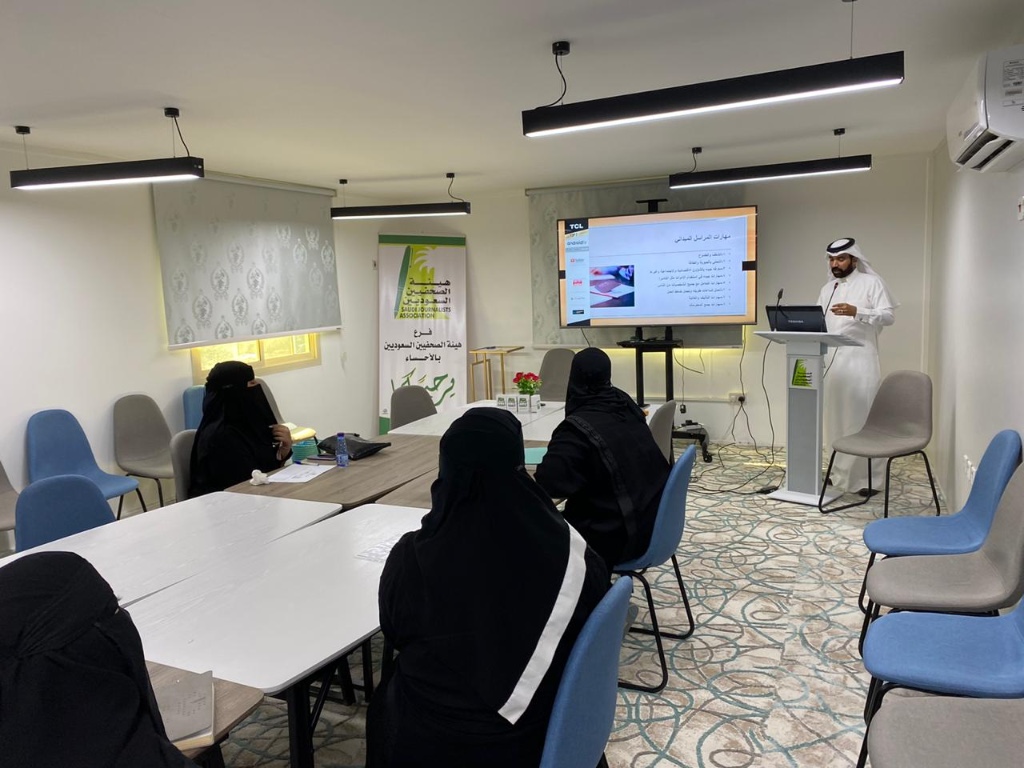 قدم الورشة التي جاءت تحت عنوان ”مهارات المراسلين الميدانيين“ عضو هيئة الصحفيين الزميل عبداللطيف المحيسن، في قاعة الجوهرة الحميان بمقر الفرع في مدينة المبرز.
