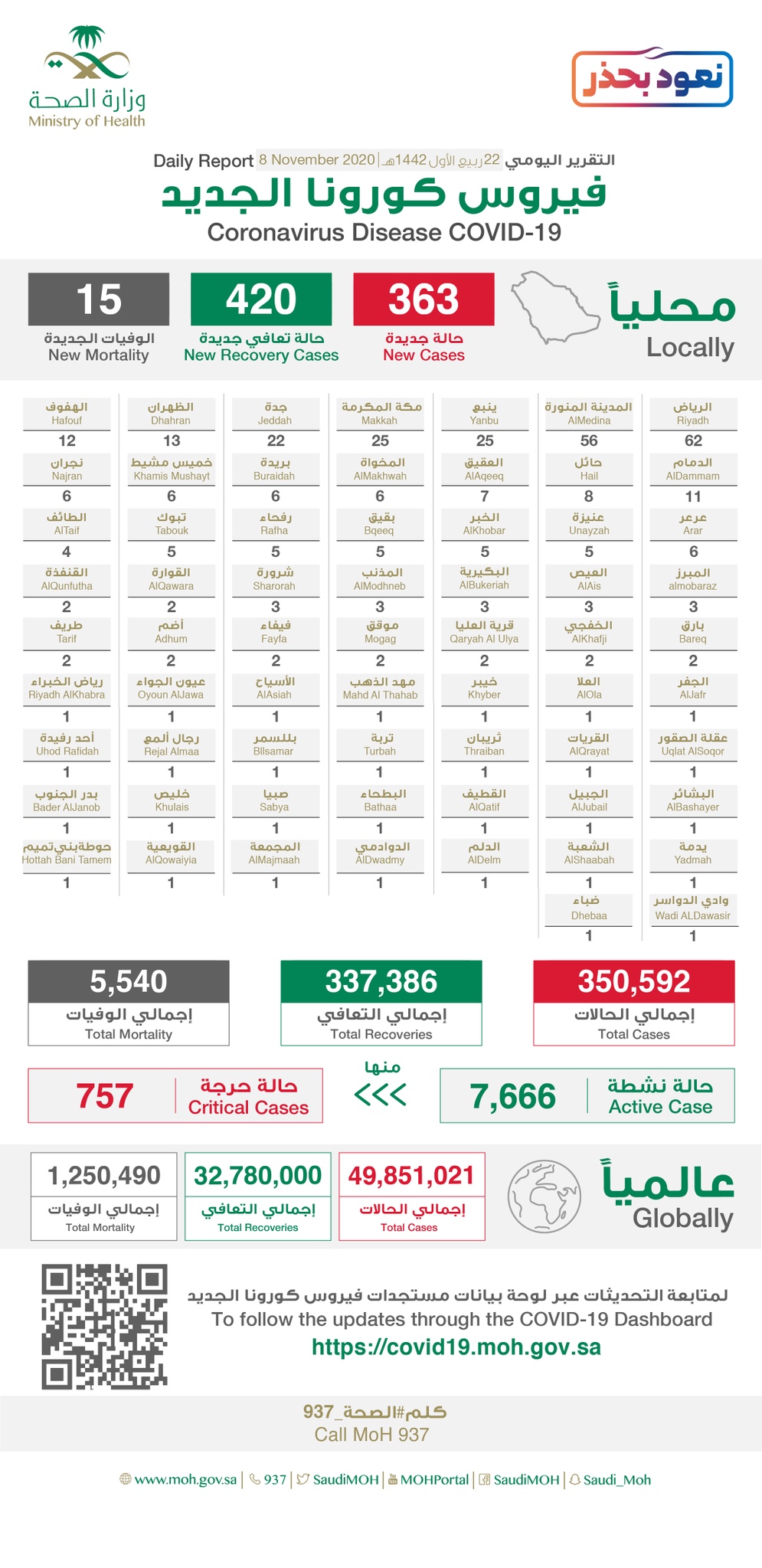 ولمعرفة تفاصيل إجمالي توزيع حالات الإصابة والتعافي، يمكن زيارة الموقع الإلكتروني المخصص من وزارة الصحة للاطلاع على مستجدات الفايروس في المملكة، والإحصاءات اليومية عبر الرابط https://covid19.moh.gov.sa/