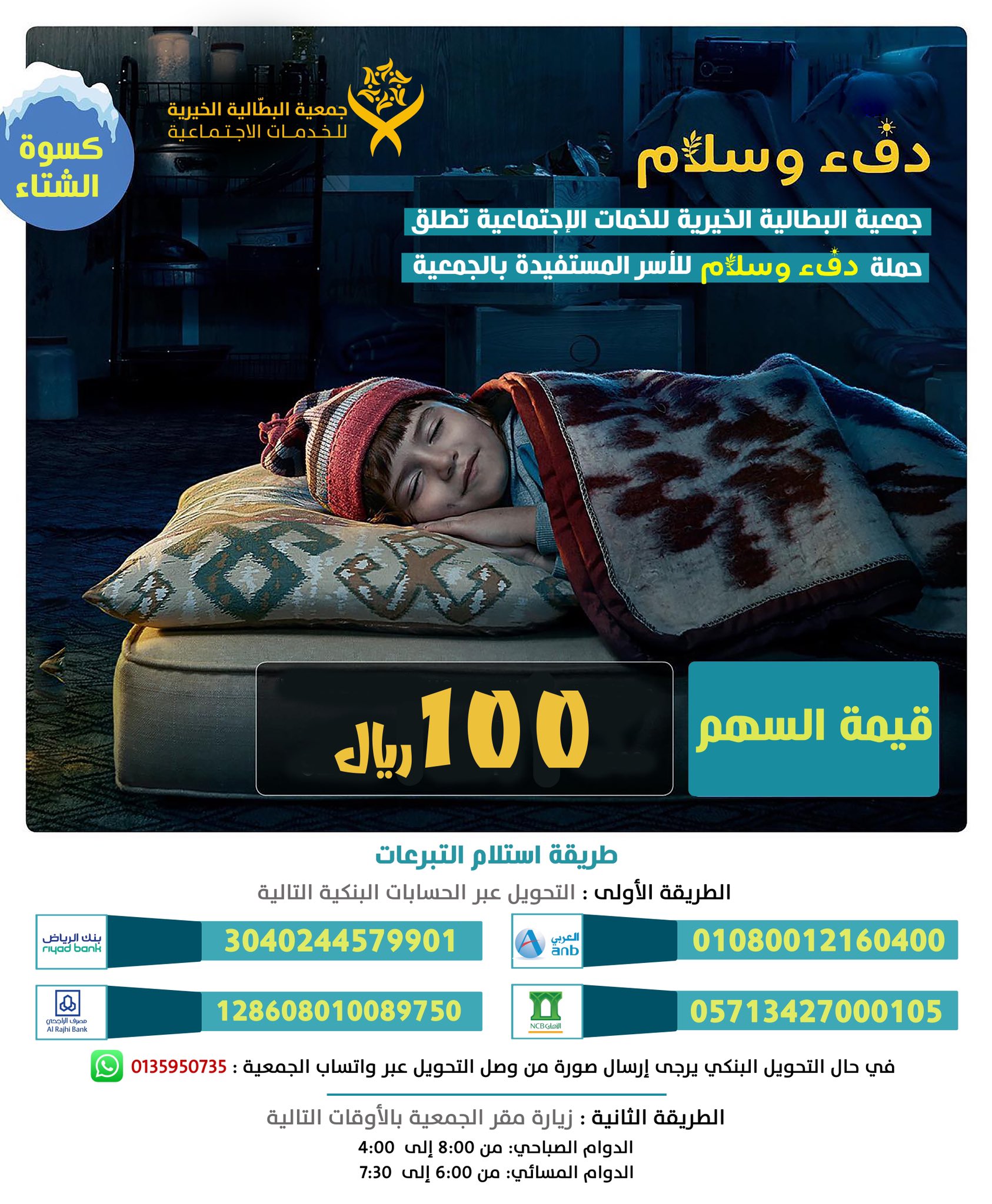 اطلقت جمعية البطالية الخيرية للخدمات الاجتماعية بمحافظة الأحساء حملة «دفء وسلام»، للتبرع بكسوة الشتاء للأسر المستفيدة من الجمعية.