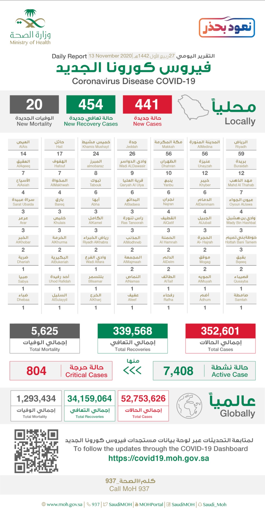 أعلنت وزارة الصحة اليوم ”الجمعة“ تسجيل 441 إصابة جديدة بفايروس كورونا المستجد المسبب لمرض ”كوفيد 19“. منها ”3“ في القطيف. ليرتفع إجمالي الإصابات في المملكة إلى 352,601 حالة مؤكدة.
