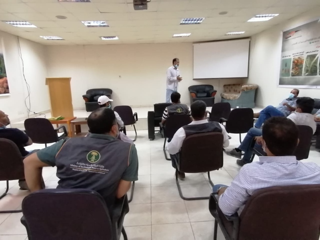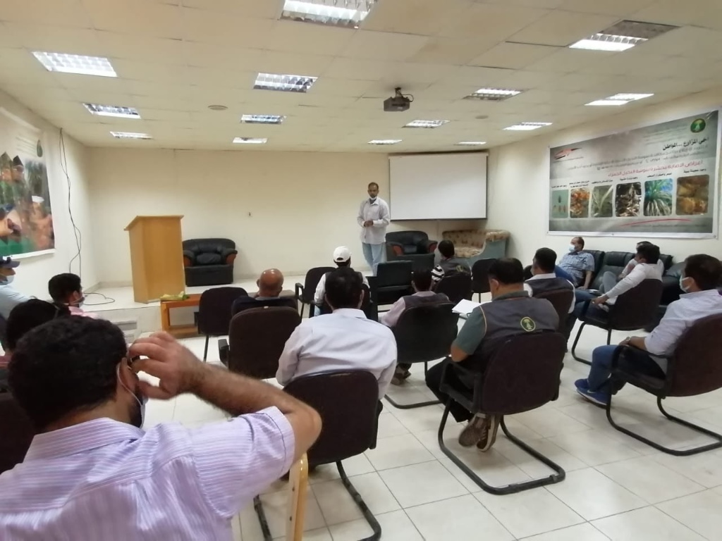 وتم استعراض البروتوكولات المتبعة التي أصدرتها وزارة البيئة والمياه والزراعة الخاصة بعلاج النخيل المصاب بسوسة النخيل الحمراء.