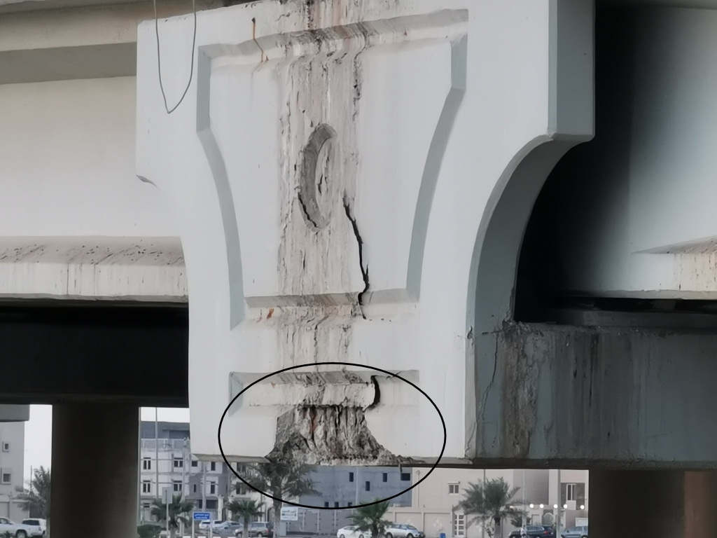 وأضاف بأن التصدع يقتصر على الجزء الديكوري فقط، والذي يغطي الفاصل الإنشائي الموجود بين كمرتين متتاليتين في الاتجاه الطولي للجسر.