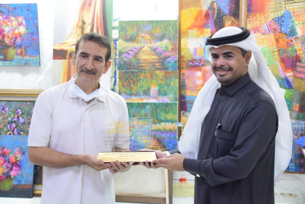 وسلم الحربي درعًا تذكاريًا من جمعية الثقافة والفنون للفنان الحجي.