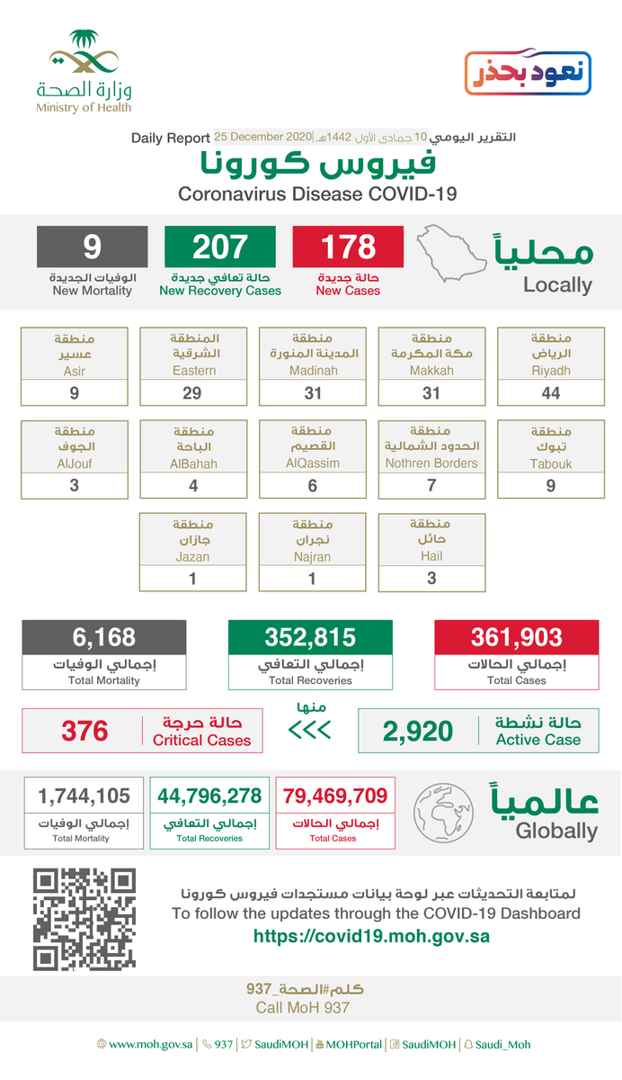 كما أعلنت الصحة عن تسجيل ”207“ حالة تماثلت للشفاء، ليصل مجموع المتعافين إلى ”352815“ حالة تعافي، فيما ارتفع إجمالي الوفيات في المملكة إلى ”6168“ حالة بعد تسجيل ”9“ حالة وفاة جديدة