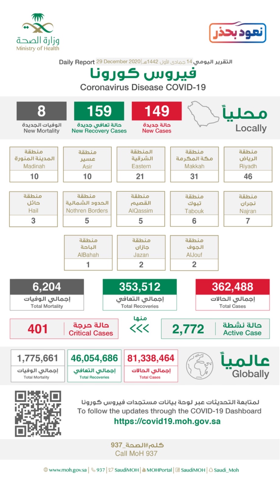 الصحة تسجل «149» إصابة جديدة بكورونا.. منها ”صفر“ في القطيف