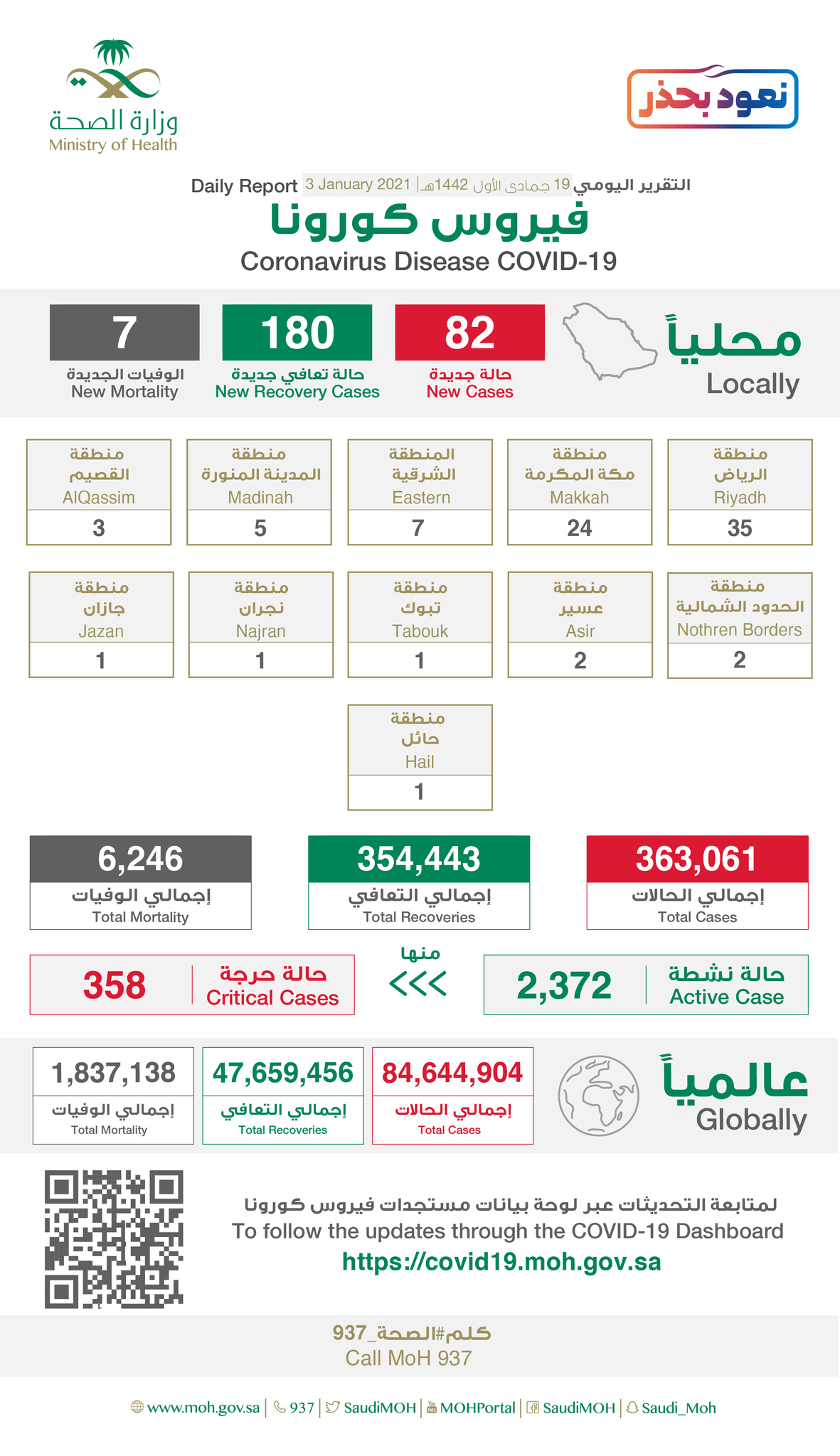 كما أعلنت الصحة عن تسجيل ”180“ حالة تماثلت للشفاء، ليصل مجموع المتعافين إلى ”354443“ حالة تعافي، فيما ارتفع إجمالي الوفيات في المملكة إلى ”6246“ حالة بعد تسجيل ”7“ حالة وفاة جديدة