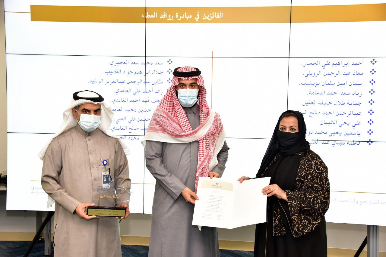 كرمت جامعة الإمام عبد الرحمن بن فيصل بالدمام، ممثلة بعمادة خدمة المجتمع والتنمية المستدامة، طلاب وطالبات الجامعة الحاصلين على أعلى عدد ساعات تطوعية مسجلة في منصة العمل التطوعي التابع لوزارة الموارد البشرية والتنمية الاجتماعية في حفل أقيم بهذه المناسبة تحت عنوان مبادرة ”روافد العطاء“.