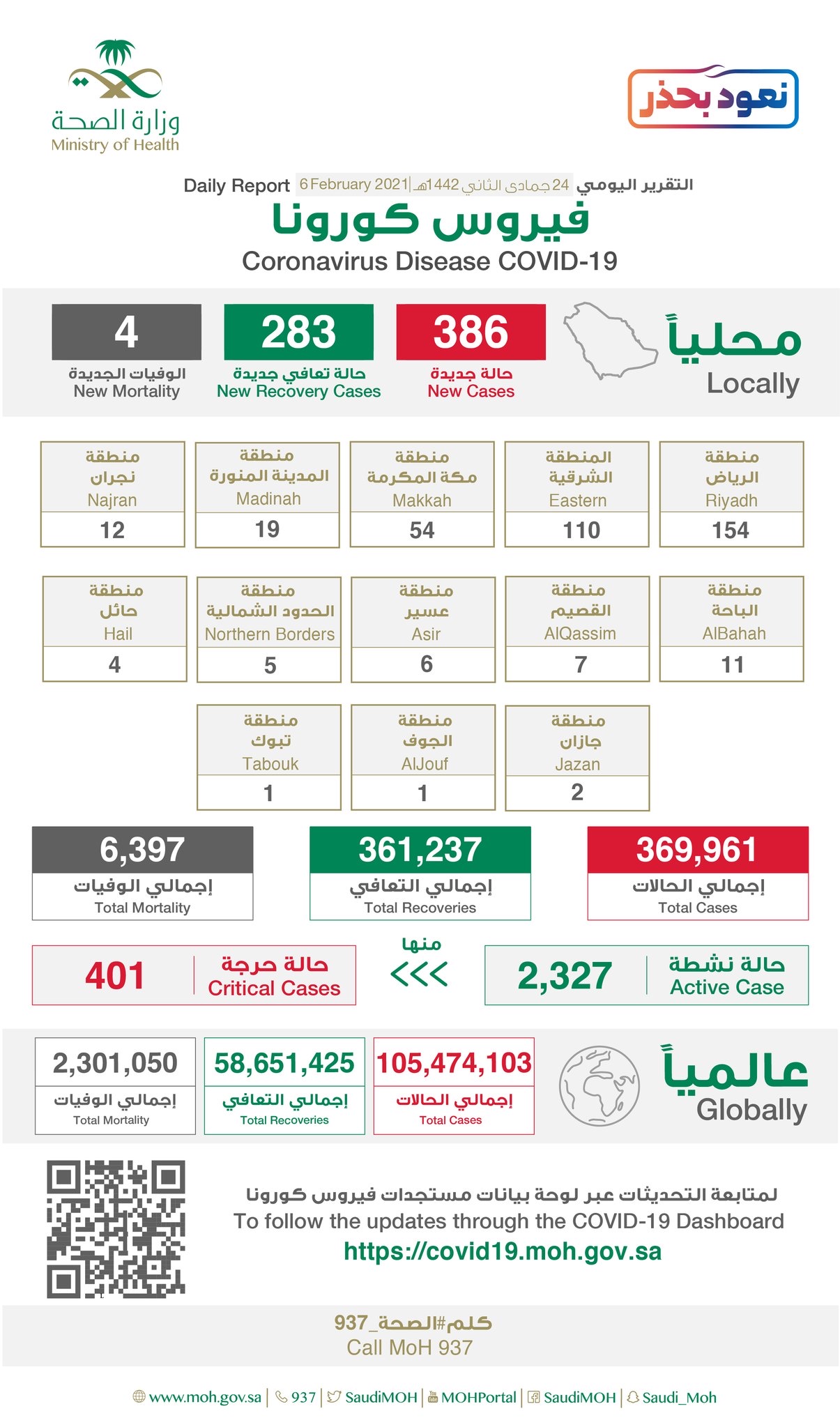 أعلنت وزارة الصحة، اليوم السبت، عن تسجيل ”386“ حالة إصابة جديدة بفيروس كورونا المستجد خلال ال 24 ساعة الماضية منها ”11“ في القطيف و”3“ في صفوى، ليرتفع إجمالي عدد الإصابات المسجلة في المملكة إلى 369,961 حالة.