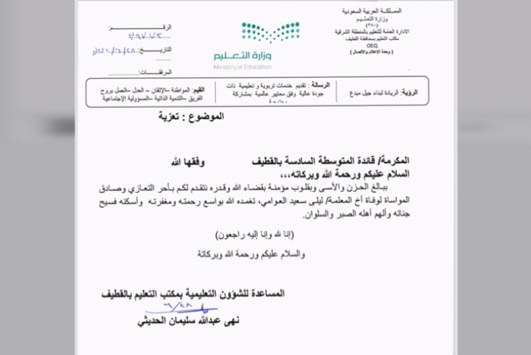 وأورد الخطاب الذي حصلت ”جهينة الإخبارية“ على نسخة منه ”ببالغ الحزن والأسى وبقلوب مؤمنة بقضاء الله وقدره نتقدم لكم بأحر التعازي وصادق المواساة لوفاة أخ المعلمة / ليلى سعيد العوامي، تغمده الله بواسع رحمته ومغفرته وأسكنه فسيح جناته وألهم أهله الصبر والسلوان“.