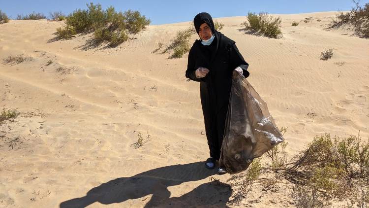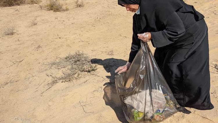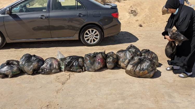 وقالت: ”بدأنا بالتنظيف من التاسعة صباحا، وواجهنا صعوبة بسبب الأجواء العاصفة، وانتهينا بحمل الأكياس متفرقة في خمس سيارات“.