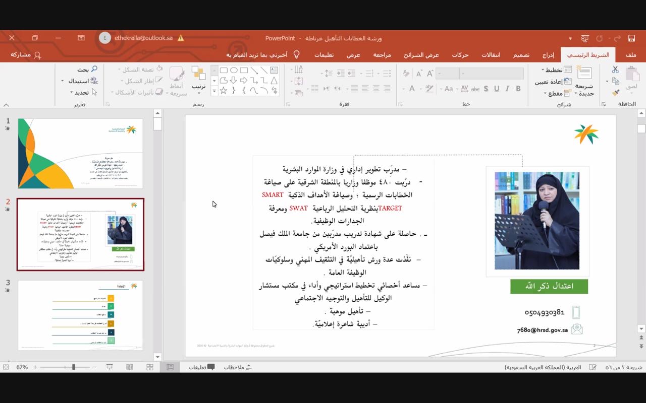 جاء ذلك تحت إشراف ومتابعة مديرة المركز عايشة بنت علي المزيد، وقدمتها مدربة التطوير الإداري في وزارة الموارد البشرية اعتدال ذكر الله ولمدة يومين عبر منصة Zoom حيث بلغ عدد الحضور 100 متدرب ومتدربة.