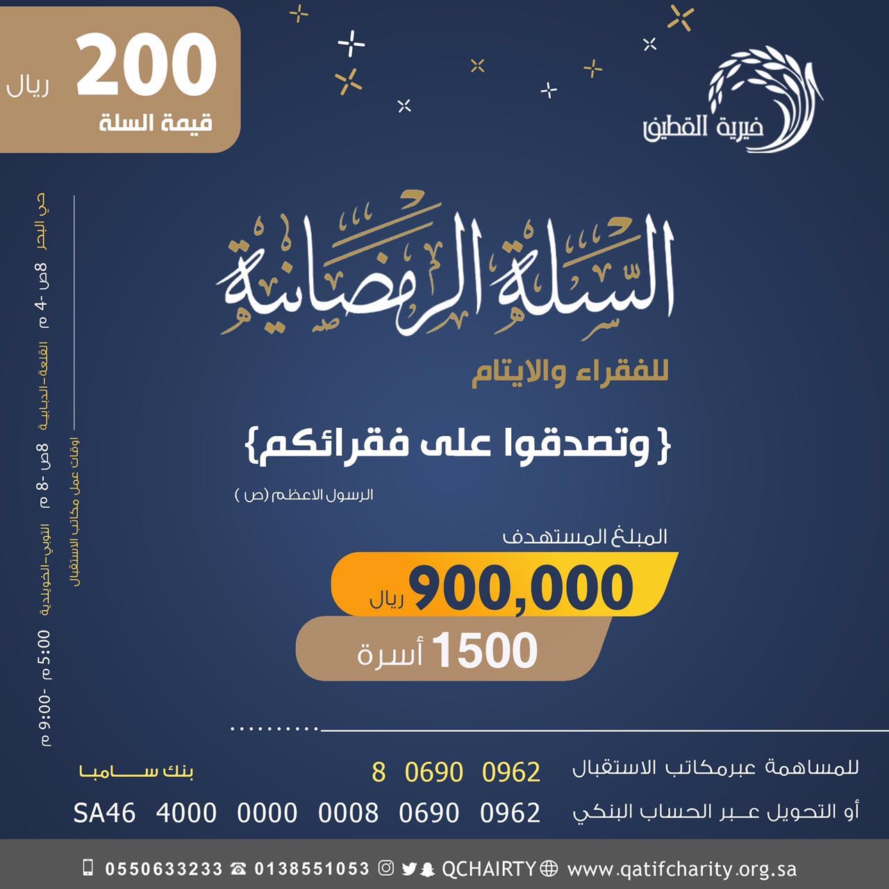 تحت شعار ”وتصدقوا على فقرائكم“، أطلقت جمعية القطيف الخيرية، مشروعها السنوي ”السلة الرمضانية“ الهادف لمساعدة الأسر المتعففة من الفقراء والأيتام ودعمهم بالمواد التموينية في شهر رمضان المبارك، وتبلغ قيمة السلة 200 ريال.
