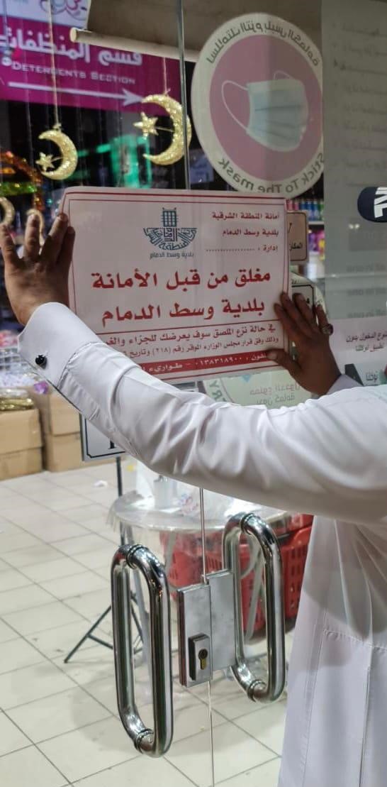 أغلقت بلدية وسط الدمام اربعة مراكز تجارية وذلك ضمن جولاتها الرقابية على المنشآت الغذائية والتجارية لمتابعة التزامها بتطبيق الاجراءات الاحترازية للحد من تفشي فيروس كورونا وذلك ضمن الإجراءات والتدابير الاحترازية التي تنفذها أمانة المنطقة الشرقية في كافة المجمعات والاسواق التجارية ومنافذ البيع بالمنطقة.