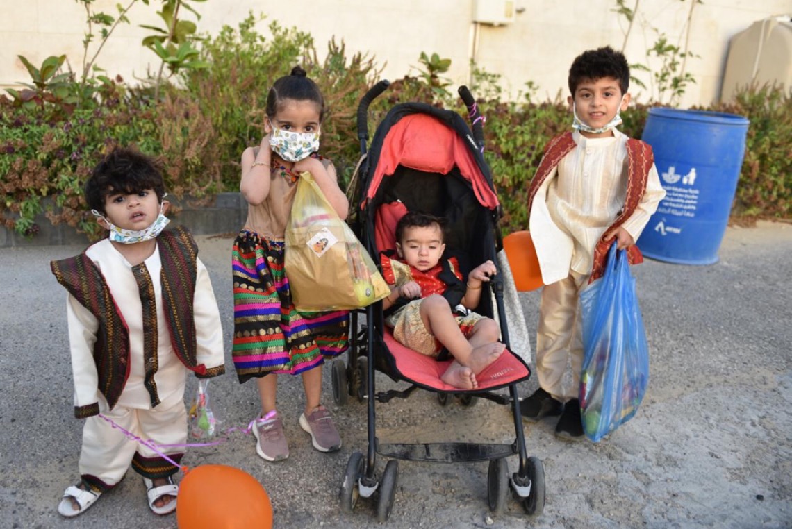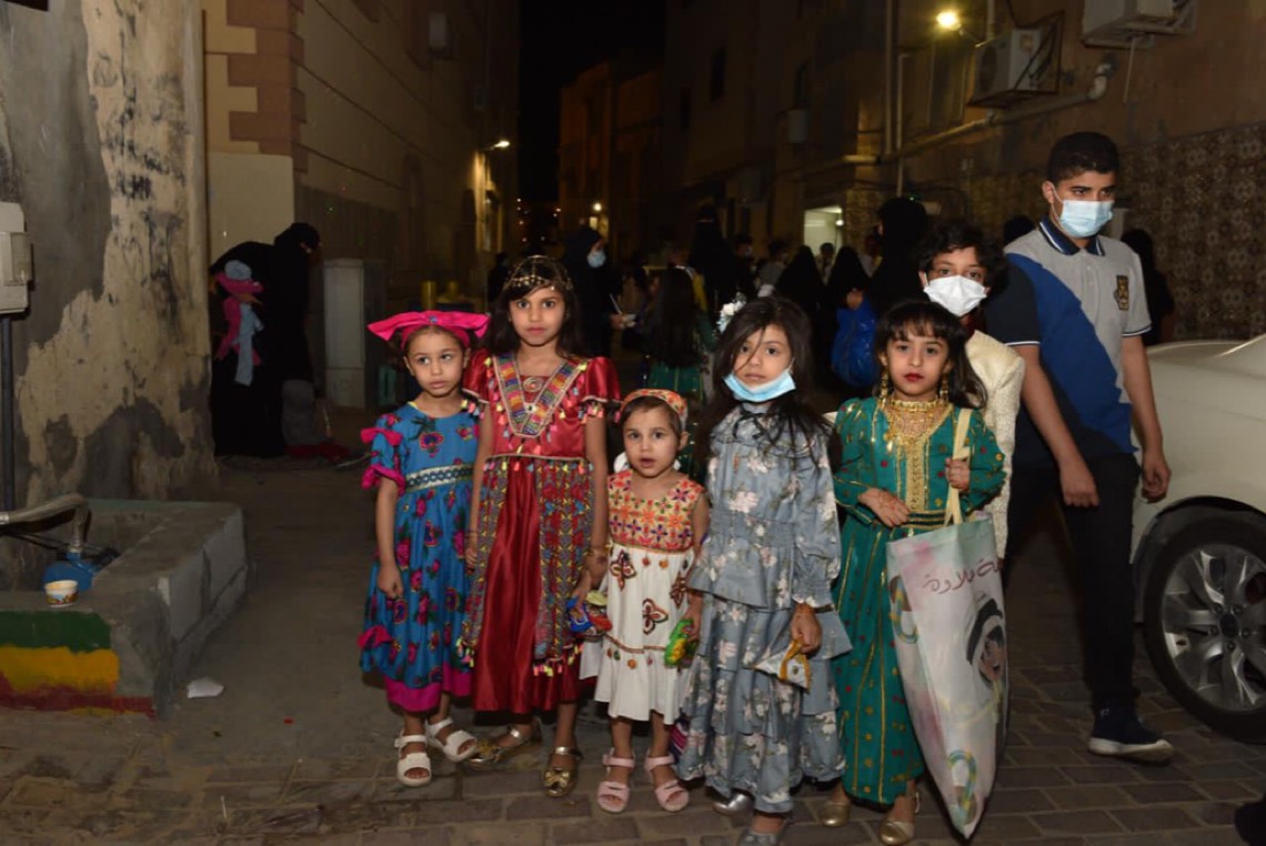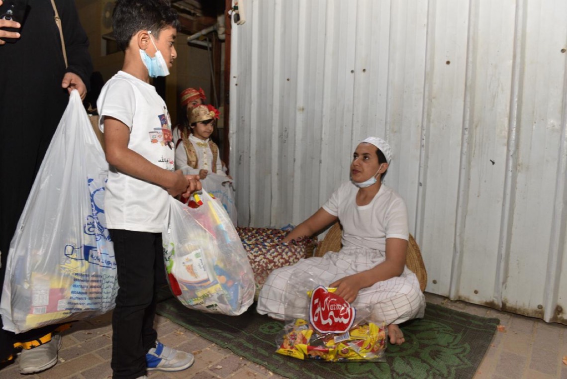 وانتشر الأطفال المتزينين بالثياب الخاصة بالقرقيعان وهم يحملون الأكياس مارين بمنازل الأقارب والجيران لجمع الهدايا والحلويات وهم يرددون بصوت مسموع ”ناصفة حلاوة اعطونا الله يعطيكم“.