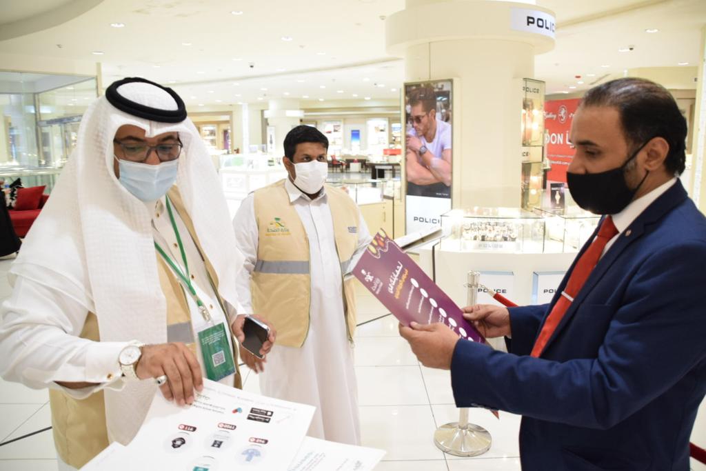 ورافق الحملة عدد من المتطوعين، شاركوا بالتوعية حول أهمية الالتزام بالإجراءات الوقائية، وتوزيع الملصقات التي تتضمن «باركود» لجميع الاشتراطات الصحية لكل منشأة.