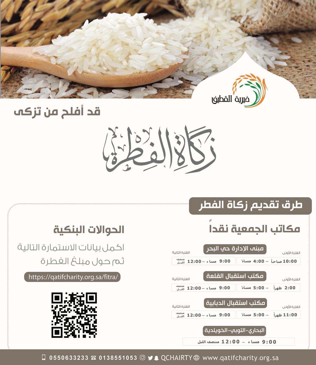 أعلنت جمعية القطيف الخيرية عن بدء استقبال زكاة الفطر نقديًا عبر مقرها بحي البحر، ومكاتبها بالقلعة والدبابية والبحاري والتوبي والخويلدية، أو من خلال التحويل البنكي بعد تعبئة الاستمارة داخل الرابط "هنا" ، وذلك ابتداءً من اليوم الخميس حتى نهاية الشهر الكريم.