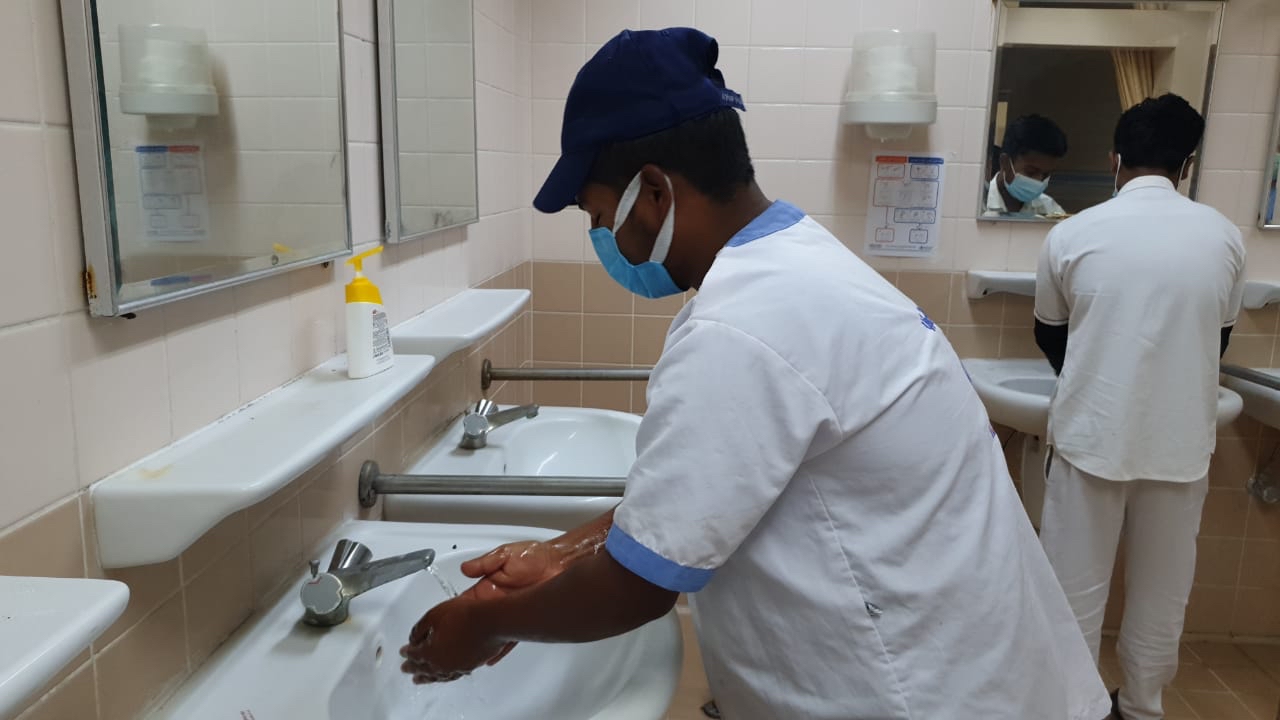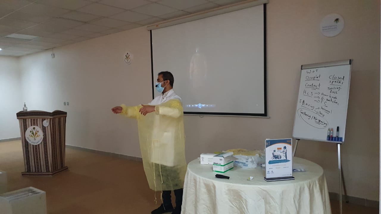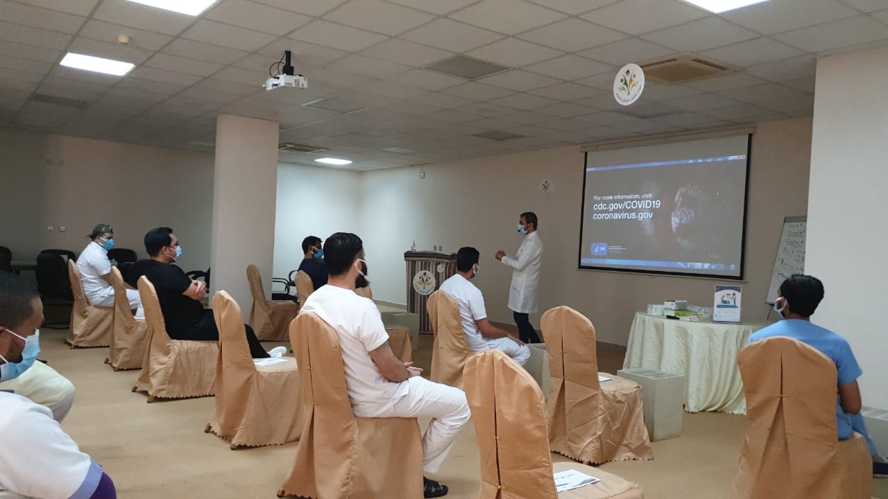 وألقى رئيس قسم الخدمات الطبية بالمركز الدكتور حسين الشويخات، محاضرة قدم فيها شرحًا وافيًا للطرق الصحيحة لعمليات غسيل الايدي وتعقيمها وكذلك ارتداء الكمام وواقي الوجة والجسم والطرق السليمة للتخلص منها، مع عرض فيديوهات توضيحية مع مشاركة احد الفنيين للشرح باللغة الأوردية لضمان وصول المعلومة.