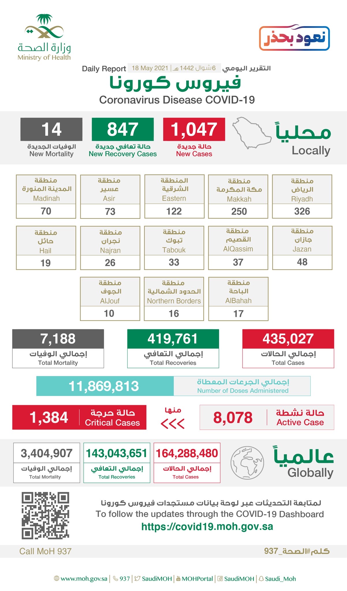 كما أعلنت الصحة عن تسجيل ”847“ حالة تماثلت للشفاء، ليصل مجموع المتعافين إلى ”419761“ حالة تعافي، فيما ارتفع إجمالي الوفيات في المملكة إلى ”7188“ حالة بعد تسجيل ”14“ حالة وفاة جديدة.