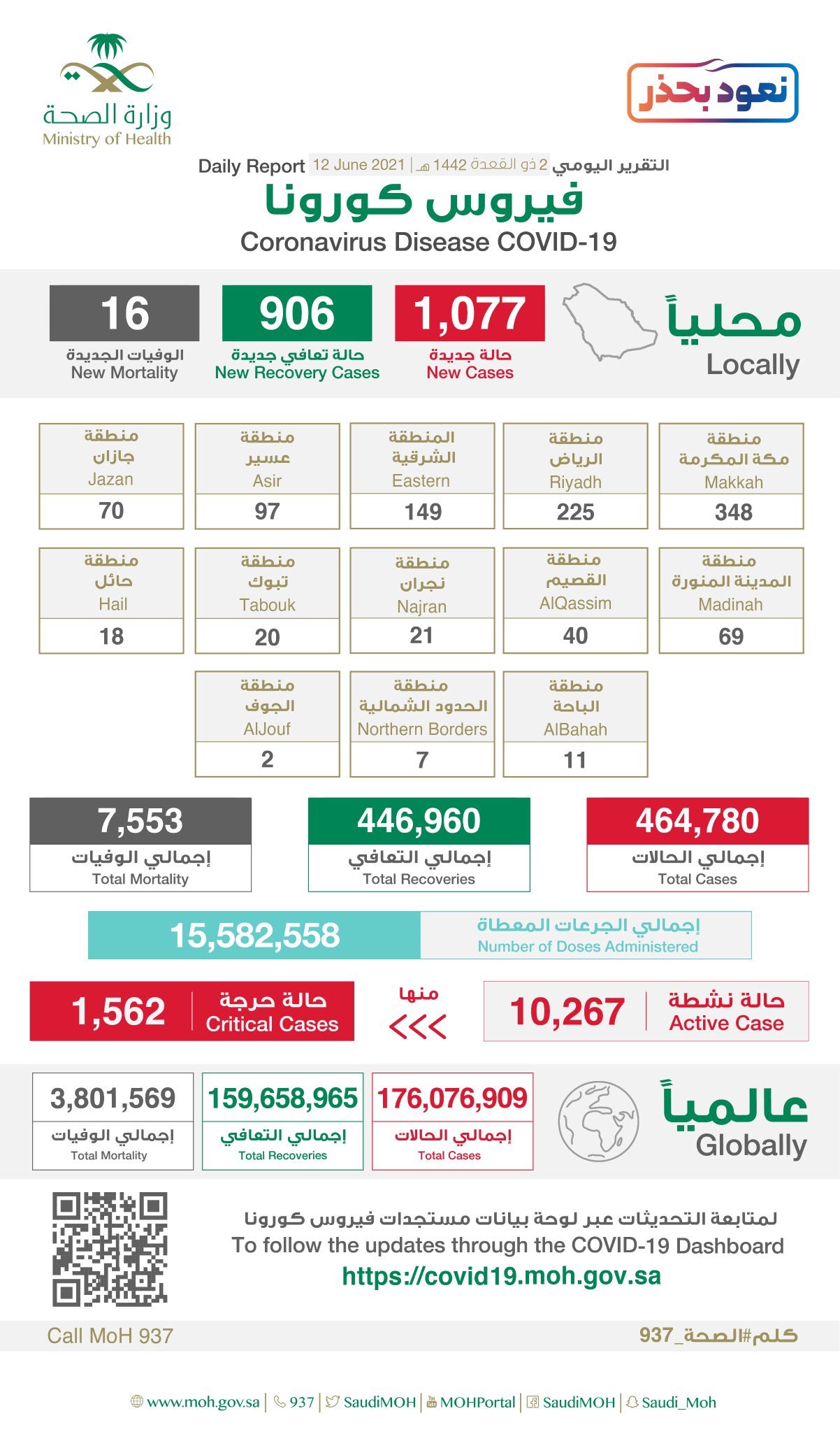 كما أعلنت الصحة عن تسجيل ”906“ حالة تماثلت للشفاء، ليصل مجموع المتعافين إلى ”446960“ حالة تعافي، فيما ارتفع إجمالي الوفيات في المملكة إلى 7553 حالة بعد تسجيل ”16“ حالة وفاة جديدة.