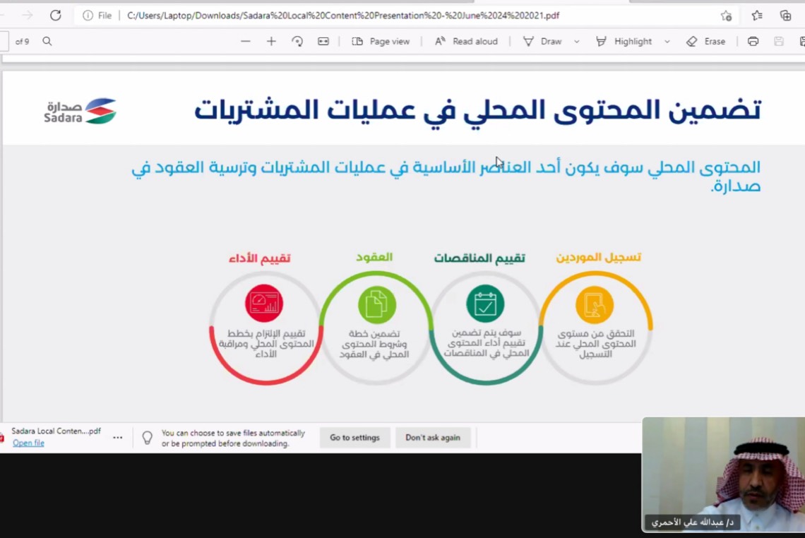 ودعا الشركات لزيادة المحتوى المحلي، حيث يصب في مصلحة الوطن في زيادة تطوير المحتوى المحلي، لافتا الى ان اعتماد البيانات بات اكثر سهولة من السابق، مطالبا الشركات بوضع خطة للسنوات القادمة لزيادة نسب المحتوى المحلي، متوقعا، اعتماد المحتوى المحلي كشرط لترسية المنافسات والمناقصات.