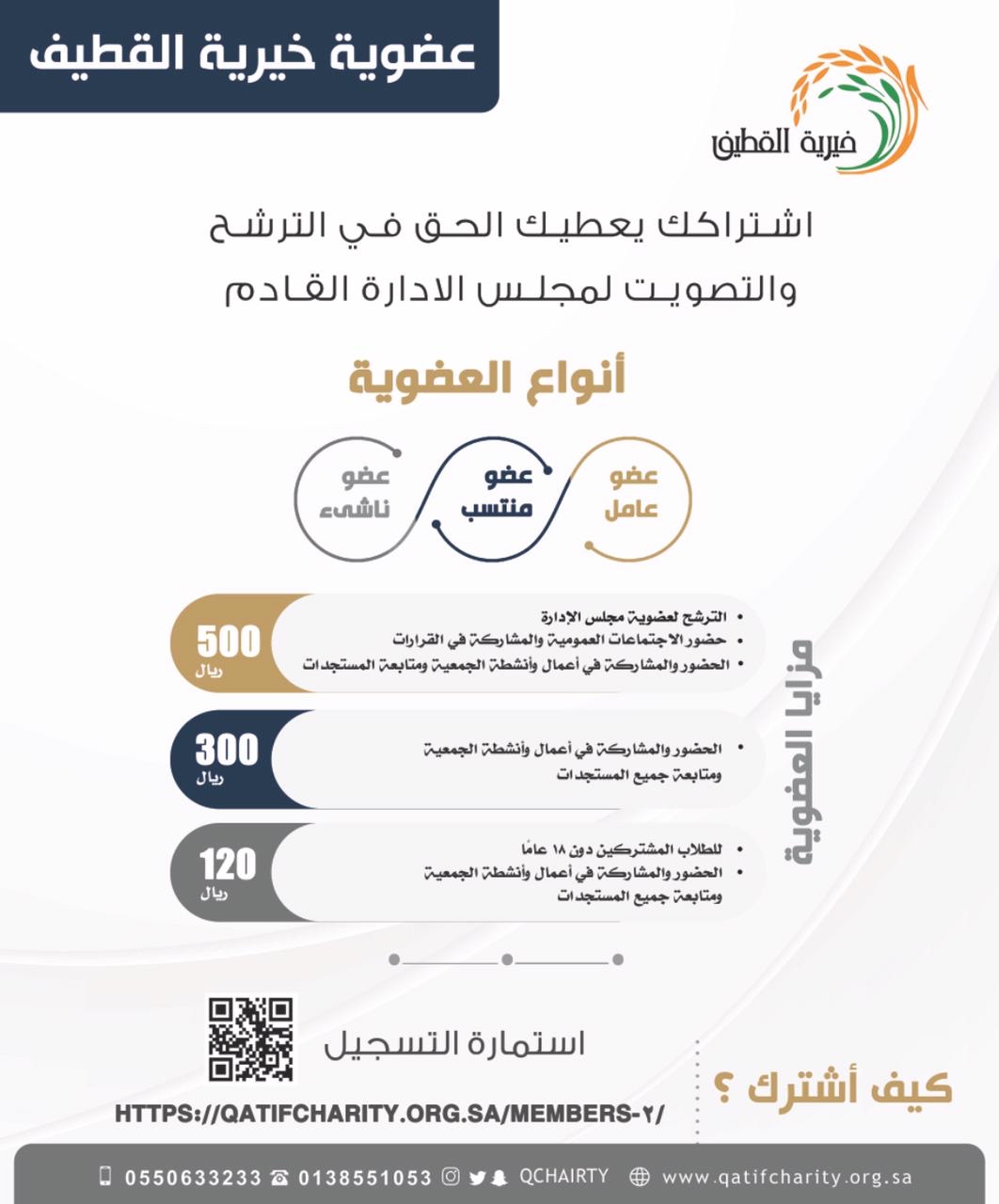 جددت جمعية القطيف الخيرية، دعوتها لأبناء المجتمع من الرجال والسيدات الخيرين المبادرين لبناء مجتمعهم، للإشتراك في عضوية الجمعية كأعضاء جدد عاملين أو منتسبين أو ناشئين، لدعم مسيرة الخير نحو المحتاجين تحقيقًا للنهضة الإنسانية.
