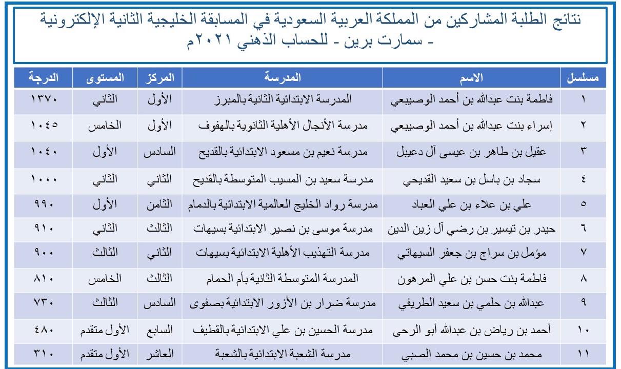 حقق أحد عشر من طلبة المملكة العربية السعودية، مراكز متقدمة في نتائج المسابقة الخليجية الثانية الإلكترونية للحساب الذهني 2021م، التي نظمتها ”سمارت برين“ بدولة الكويت.