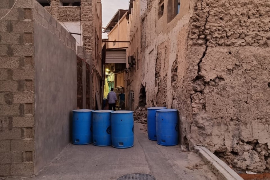 ”براميل الحاويات الخمسة“، المصفوفة في الطريق الضيق بأحد أزقة حي الديرة بجزيرة تاروت، تعتبر دلالة على خطورة استخدام الطريق من لدن المارة.