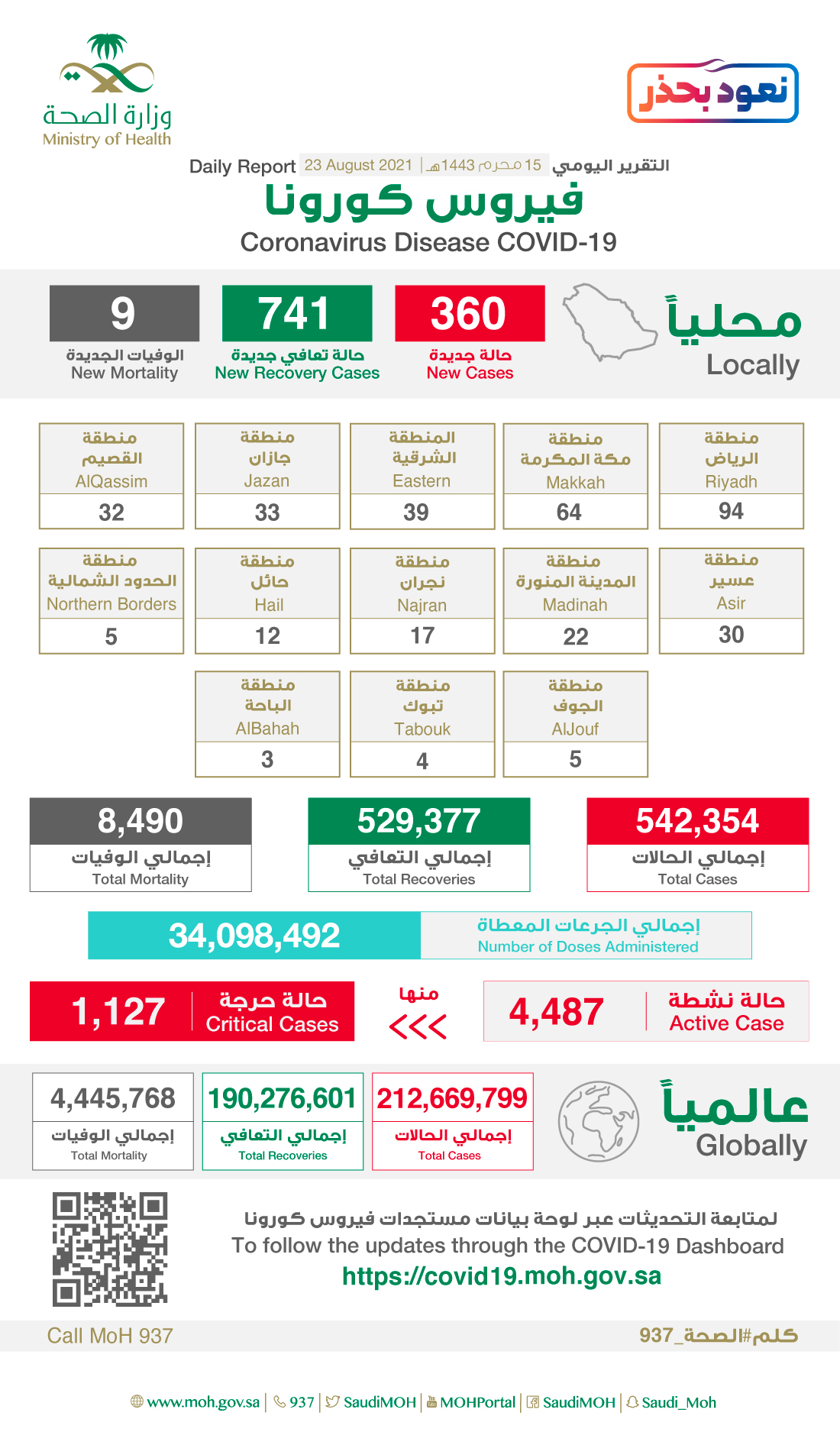 أعلنت وزارة الصحة إحصائية جديدة لمستجدات كورونا في المملكة خلال ال 24 ساعة الماضية تضمنت تسجيل ”360“ حالة مؤكدة. منها ”4“ في القطيف.