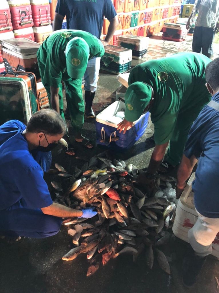 نفذ فرع وزارة البيئة والمياه والزراعة بالمنطقة الشرقية مركز أبحاث الثروة السمكية وبالتعاون مع شرطة محافظة القطيف، عملية تفتيش مفاجئة على سوق الأسماك المركزي بمحافظة القطيف لمعاينة الأسماك المحظور صيدها ”صغيرة الحجم“، أسفرت عن مصادرة وإتلاف ”170“ كيلوجراما من الأسماك من أنواع ”الهامور والصافي والقرقفان“.