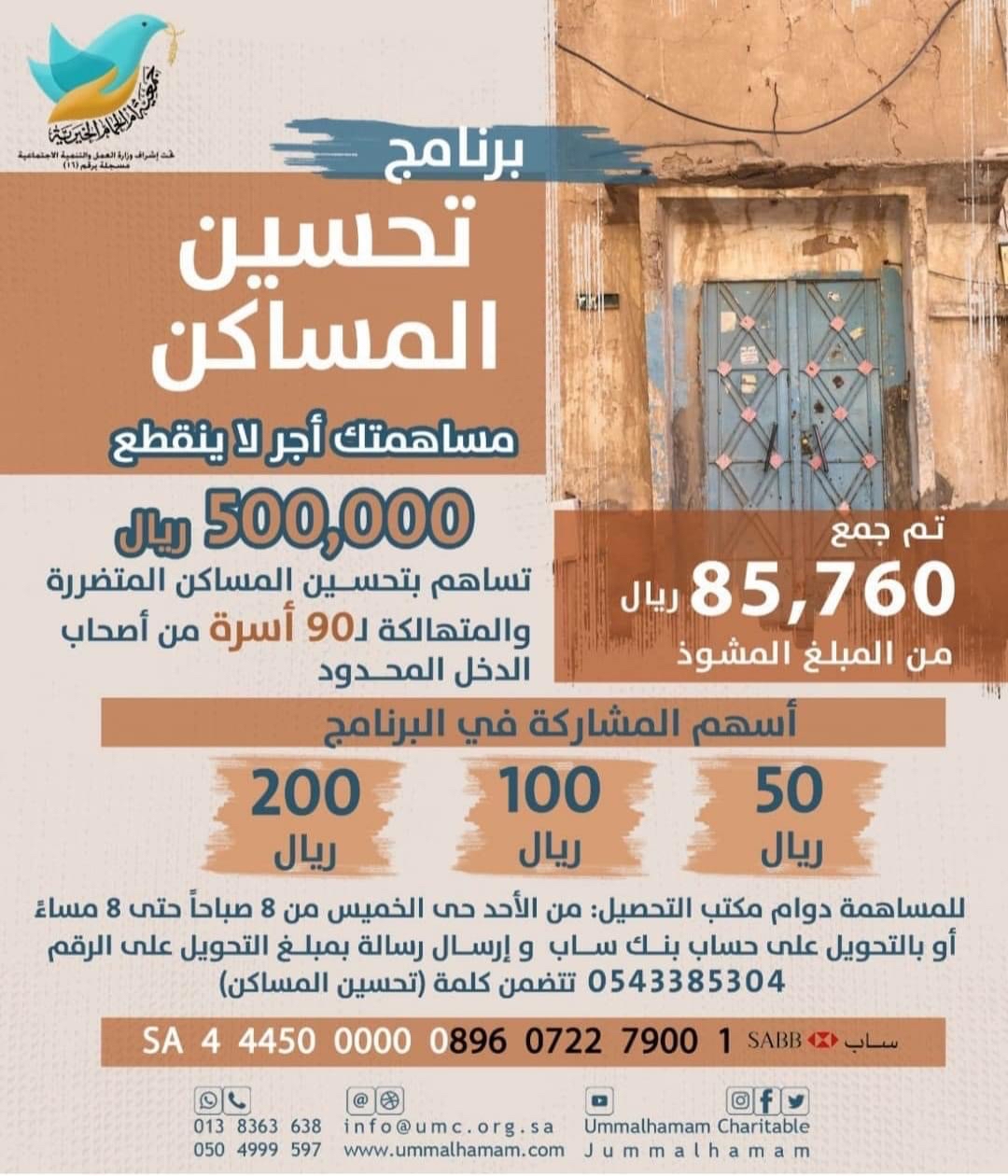 وأوضحت الجمعية من خلال إعلانها الذي أطلقته لهذا البرنامج أنها تستهدف مبلغ 500 ألف ريال من أجل تحسين مساكن 90 أسرة متضررة أو متهالكة وبينت أنها جمعت حتى الآن مبلغ 85760 ريال.