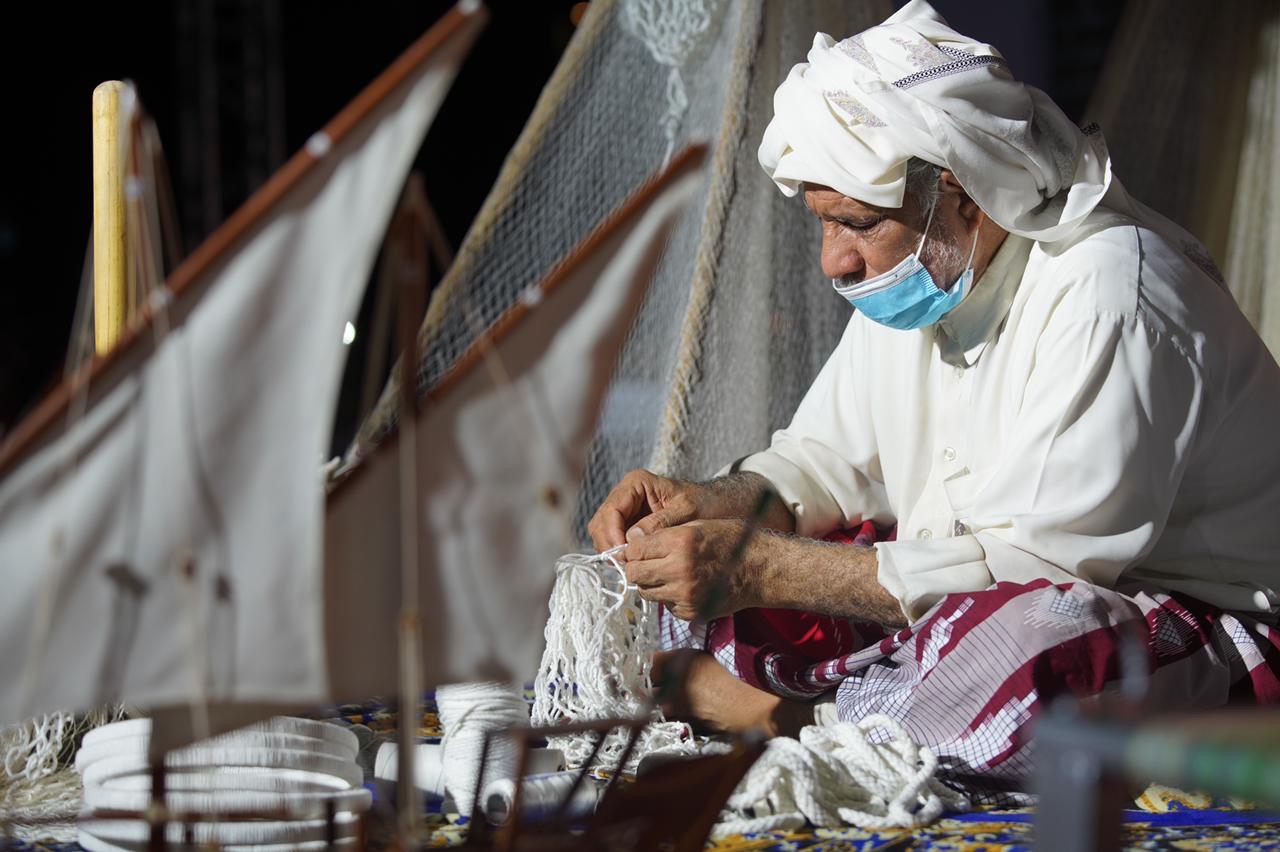 ”حسين بن علي“، قضى 50 عاما في صناعة شبكات الصيد من خلال العديد من الألياف التي يتم نسجها على هيئة شبكة، وتطورت صناعة هذه الألياف عبر الأزمنة، فكانت قديمًا تُصنَّع من الأعشاب والكتان ومن أشهرها ”الدنادين“ للغطس و”القراقير“ للصيد، ويقضي العم حسين ساعات طويلة في فعالية ”تحيا السعودية“ ليصنع شبكة الصيد ”ديين“ و”السالية“.