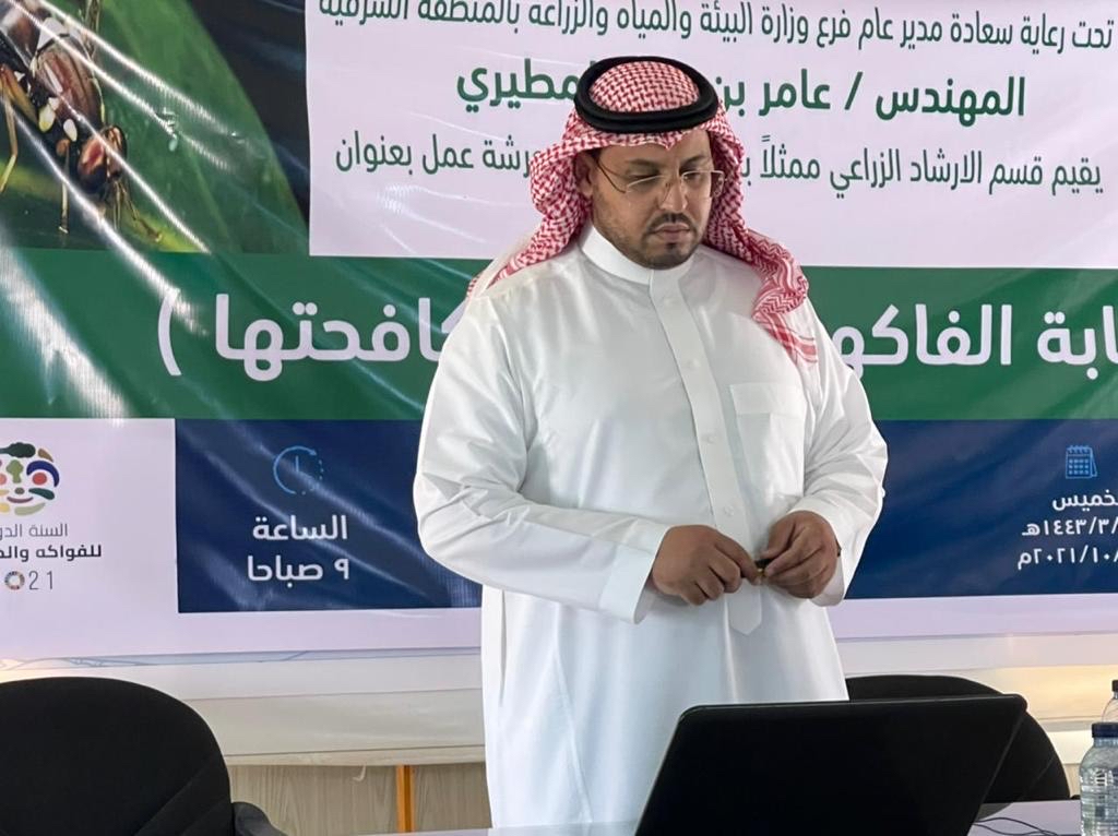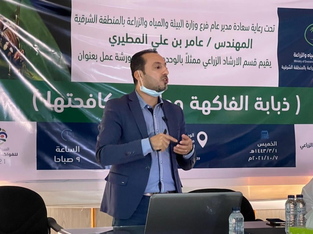 فيما ألقى المحاضرة المهندس طلال بن عبدالله المطيري نائب مدير إدارة الصحة النباتية بالوزارة تطرق خلالها الى أهم أنواع ذباب الفاكهة في السعودية وجهود المملكة في مكافحة ذباب الفاكهة، وحصر أنواع ذباب الفاكهة في المنطقة الجنوبية والشمالية 2004 م بالتعاون مع خبراء منظمة الاغذية والزراعة للامم المتحدة FAO.