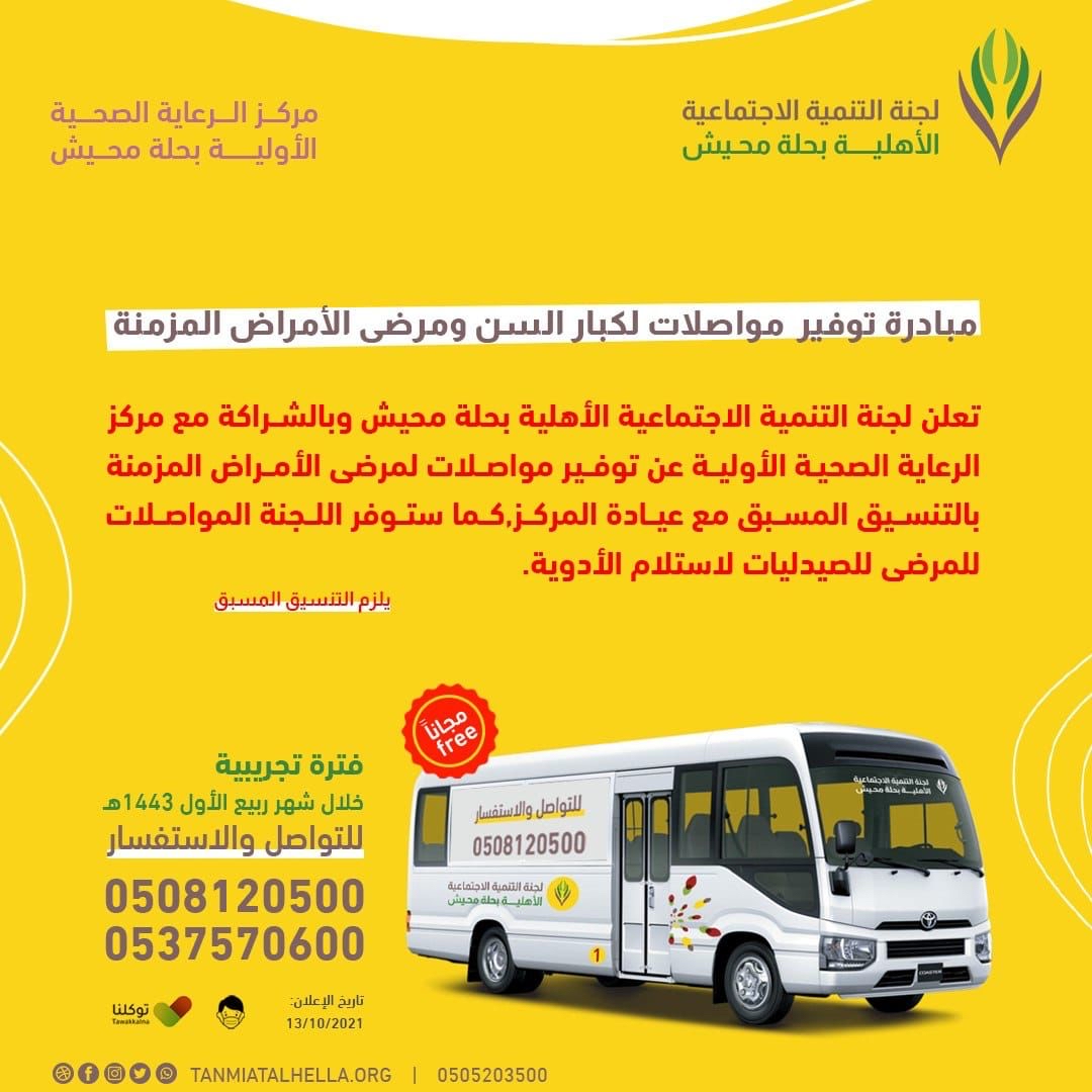 أعلنت لجنة التنمية الاجتماعية الأهلية بحلة محيش، توفير مواصلات مجانية لمرضى الأمراض المزمنة من كبار السن، الذين لا تتوفر لديهم وسيلة مواصلات، وذلك بالتنسيق المسبق مع عيادة المركز، وبالشراكة مع مركز الرعاية الصحية الأولية.