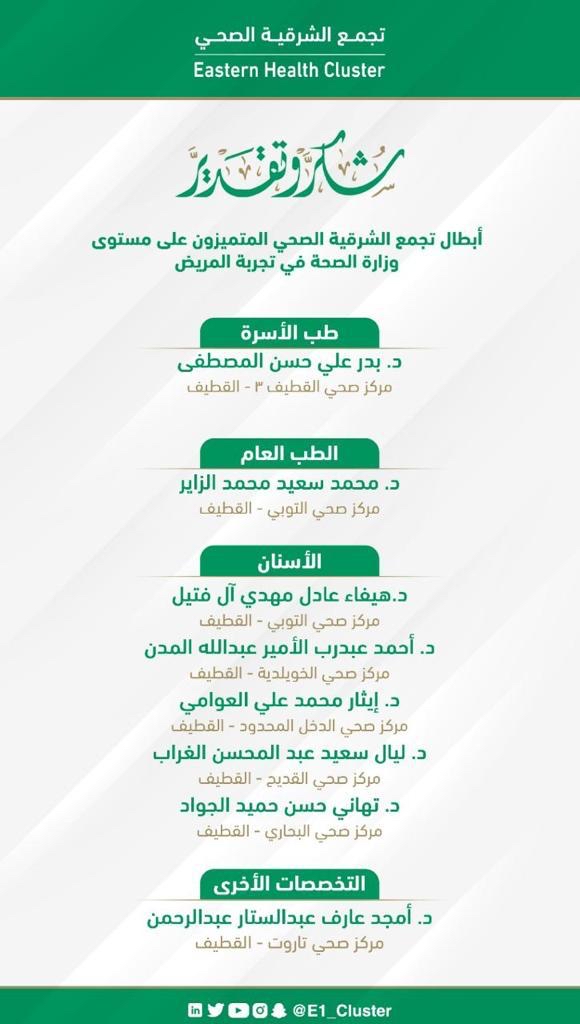 حيث حصل الدكتور محمد سعيد الزاير من مركز صحي التوبي على المركز الثاني على المملكة. فيما حصل الدكتور بدر المصطفى من مركز صحي القطيف 3 على المركز الرابع على المملكة.