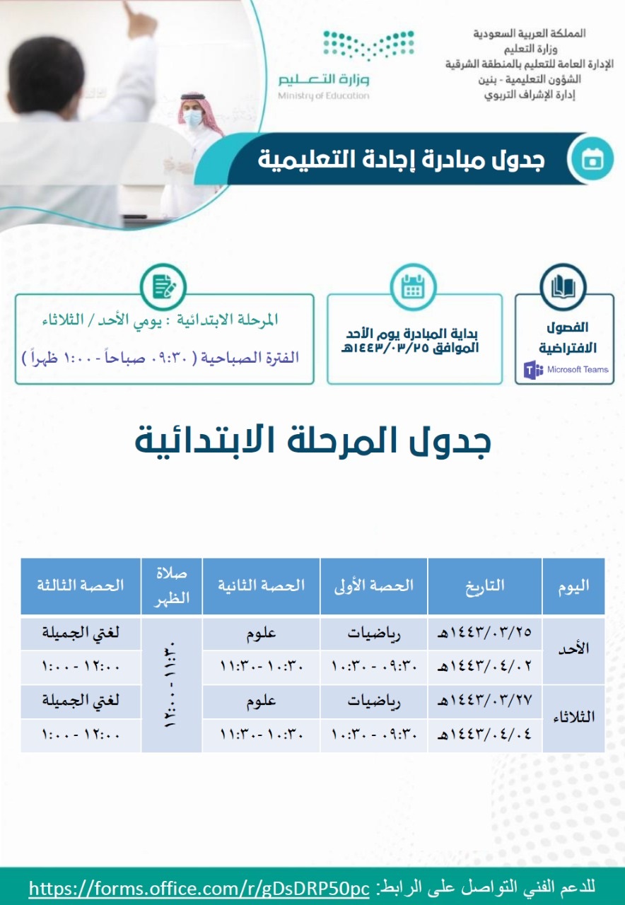 أطلقت الإدارة العامة للتعليم بالمنطقة الشرقية ممثلة بإدارة الإشراف التربوي بقطاعيه ”البنين والبنات“، اليوم الأحد، النسخة الثالثة من مبادرة إجادة التعليمية لجميع المراحل الدراسية والتي تهدف إلى تعزيز المهارات في مواد ”اللغة العربية - الرياضيات - العلوم - اللغة الإنجليزية - الكيمياء - الفيزياء - الأحياء“ عبر الفصول الافتراضية