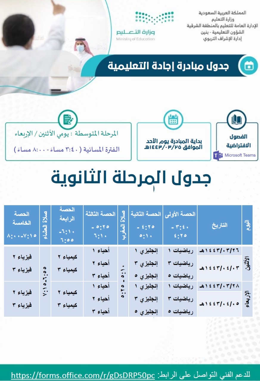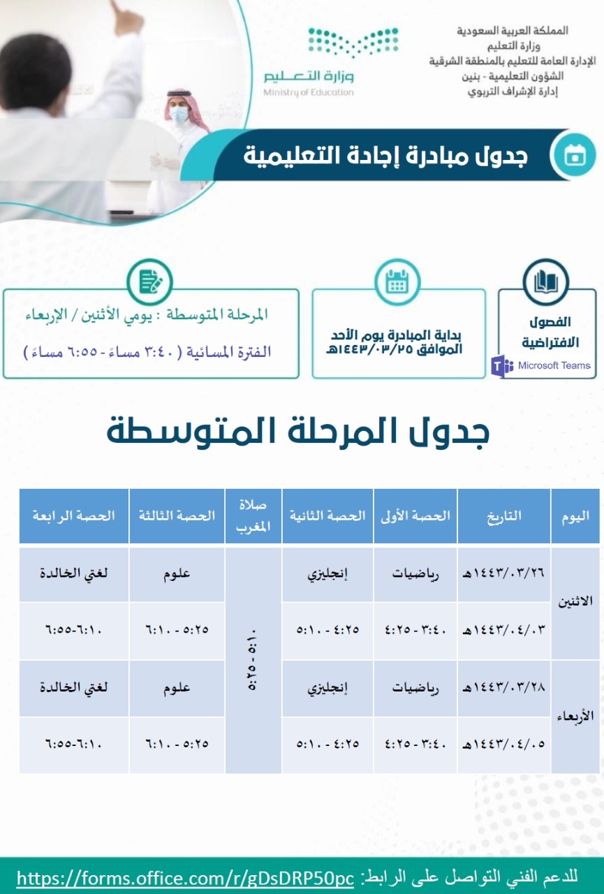 فيما تبدأ المبادرة غدٍ الإثنين والأربعاء من الأسبوع الحالي والمقبل لطلبة المرحلة المتوسطة في مواد ”لغتي الخالدة، والرياضيات، واللغة الإنجليزية والعلوم“. وكذلك المرحلة الثانوية حسب أرقام المقررات التالية ”الرياضيات 1-3-5، اللغة الإنجليزية 1-3-5، فيزياء 2-3، كيمياء 2-3، أحياء 1-2-3“