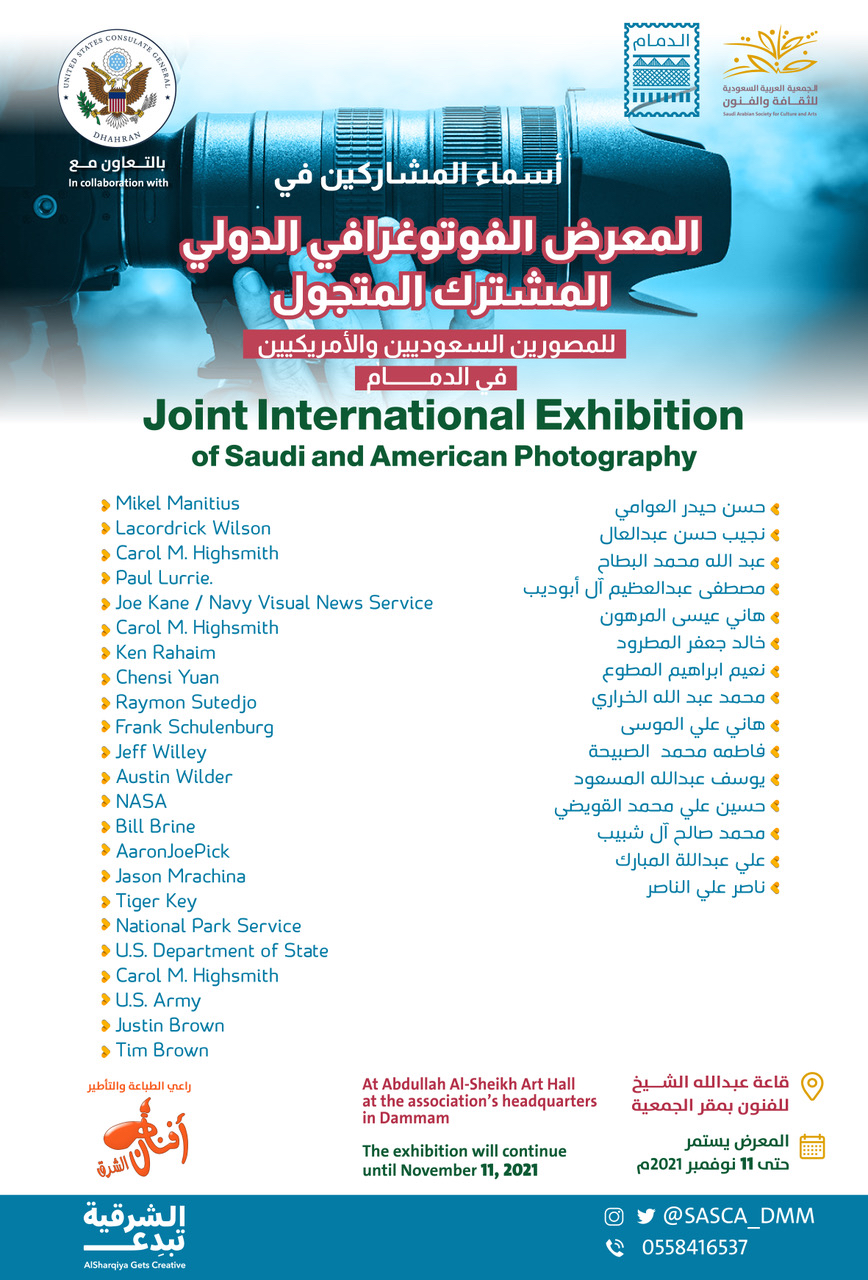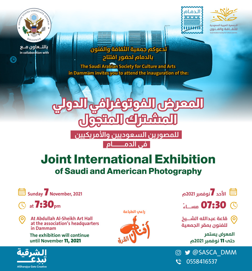يفتتح القنصل العام الأمريكي في القنصلية الأمريكية في الظهران ديفيد إدجينتون، الأحد المقبل، معرضًا دوليًا مشتركًا يعرض أعمال عدد من المصورين الأمريكيين والسعوديين، في قاعة عبدالله الشيخ للفنون بمقر الجمعية، في الفترة من 7 إلى 11 نوفمبر 2021م، وذلك بالتعاون مع الجمعية العربية السعودية للثقافة والفنون في الدمام.