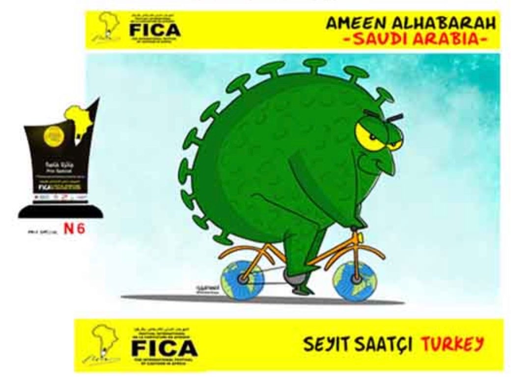 حصل رسام الكاريكاتير أمين الحباره على الجائزة خاصة في المسابقة الدولية الرابعة للكاريكاتير بالمغرب «FICA» في نسختها الرابعة 2021 بعنوان“كيف غيّر فيروس كورونا العالم؟”.