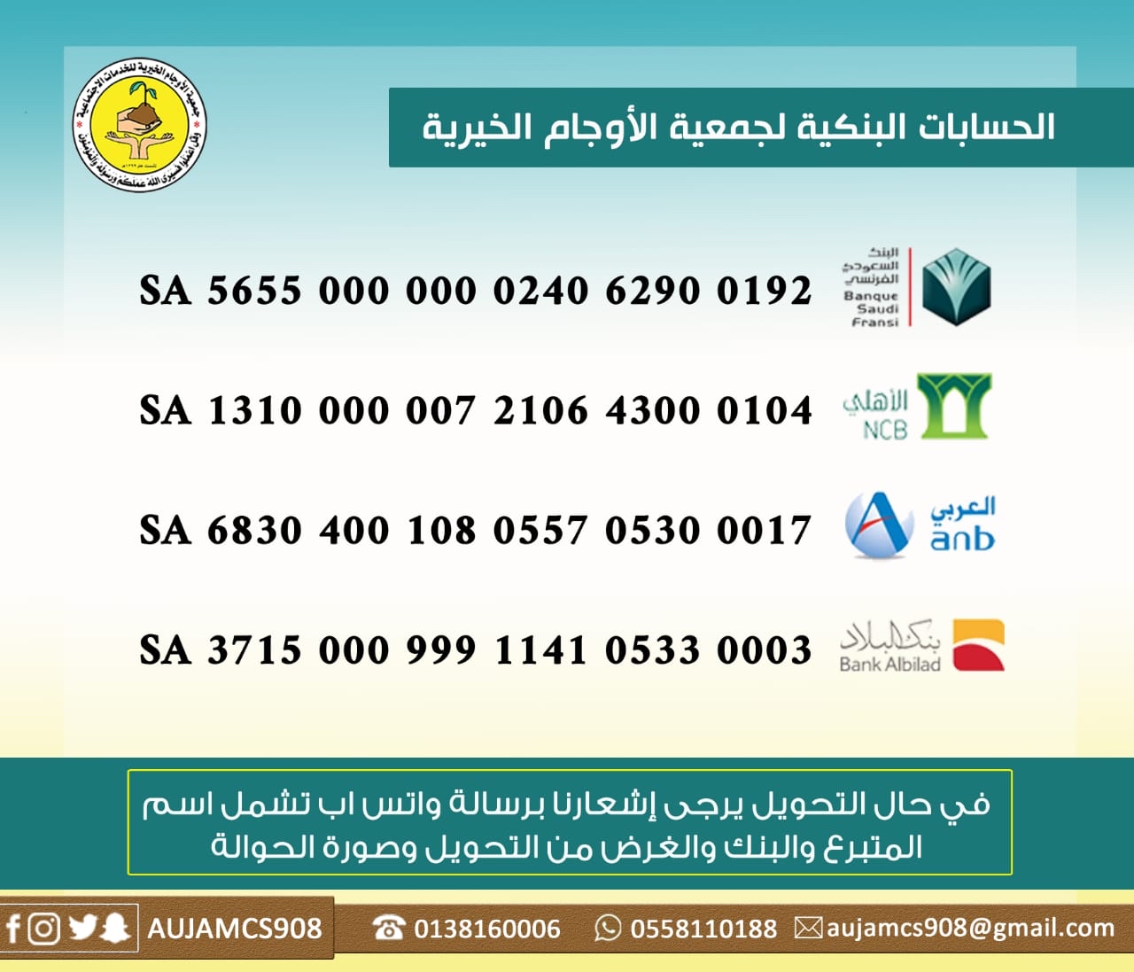 هذا ويمكن تقديم الدعم عن طريق الإيداع في الحسابات البنكية للجمعية الموجودة بالإعلان، أو زيارة مكتب استقبال الجمعية من السبت إلى الخميس، من التاسعة والنصف صباحا إلى الواحدة والظهر مساء، ومن الخامسة إلى العاشرة مساء.