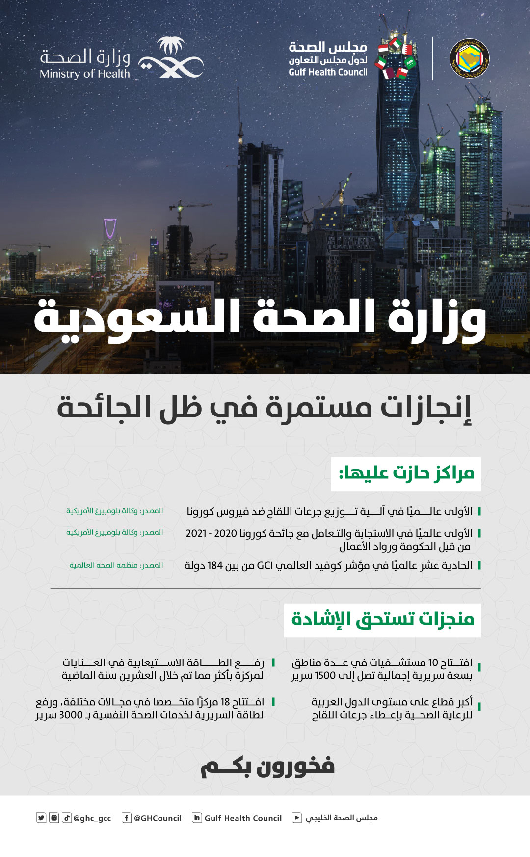 ومن أهم إنجازات وزارة الصحة حصولها على المركز الأول عالمياً في آلية توزيع جرعات اللقاح ضد فيروس كورونا، والأولى عالمياً في الاستجابة والتعامل مع الجائحة، والحادي عشر عالمياً في مؤشر كوفيد العالمي GCI من بين 184 دولة.