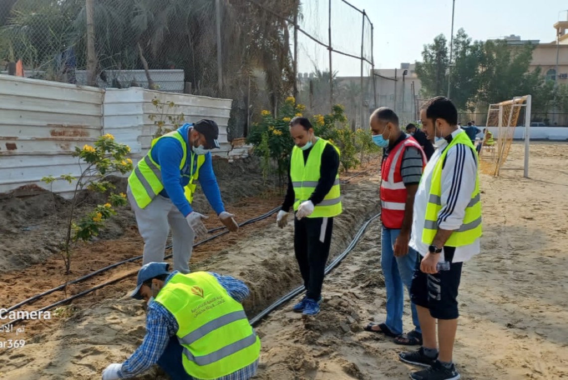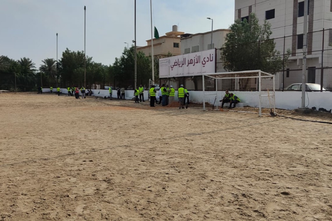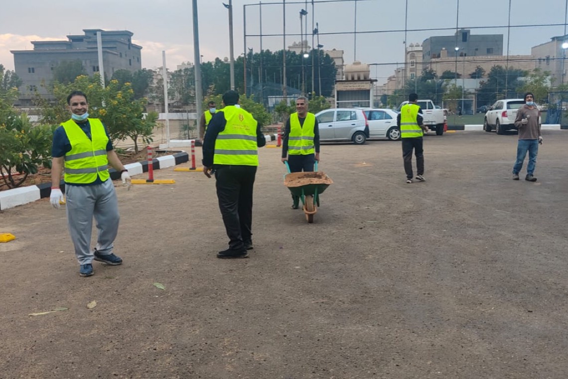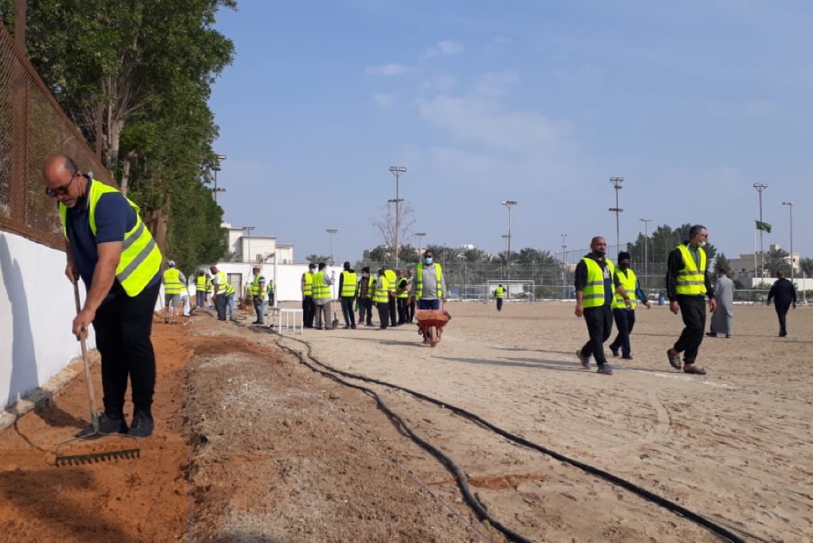 وقام المتطوعين بحفر وتجهيز الأحواض الزراعية على امتداد جوانب الملعب واضافة التربة الزراعية والأسمدة، حيث سيصل مجموع الأشجار المزروعة إلى حوالي 250 شجرة وأكثر من 5000 زهرة.