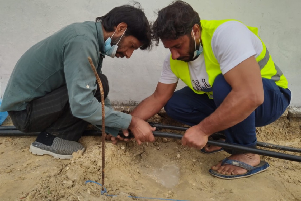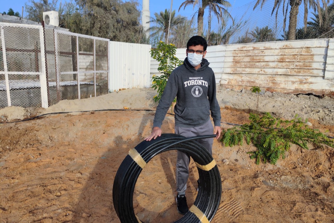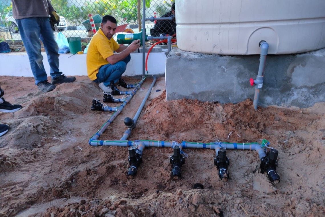 كما تم عمل شبكة ري بنظام التنقيط على كامل مساحة الأحواض الزراعية والتي يقدر طولها ب حوالي 457 متر طولاً في 2 متر عرضاً، لضمان الري المنتظم للنباتات والحفاظ عليها ولضمان نمو الشتلات والنباتات.