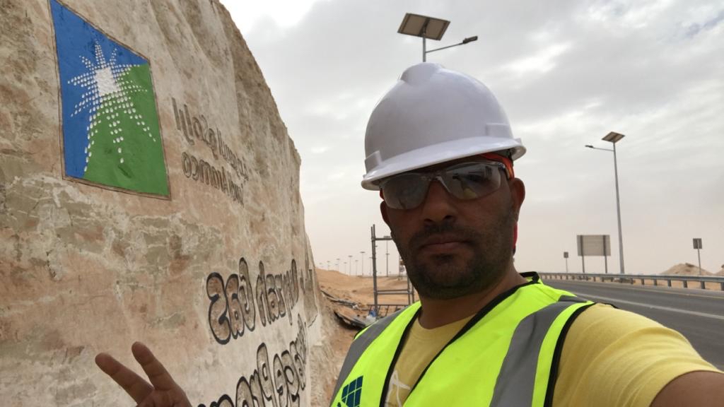 واضاف: ”تم رسم شكل المصنع وكتابة اسم المشروع بالانجليزي وشعار ارامكو باستخدام قلم الماركر“.