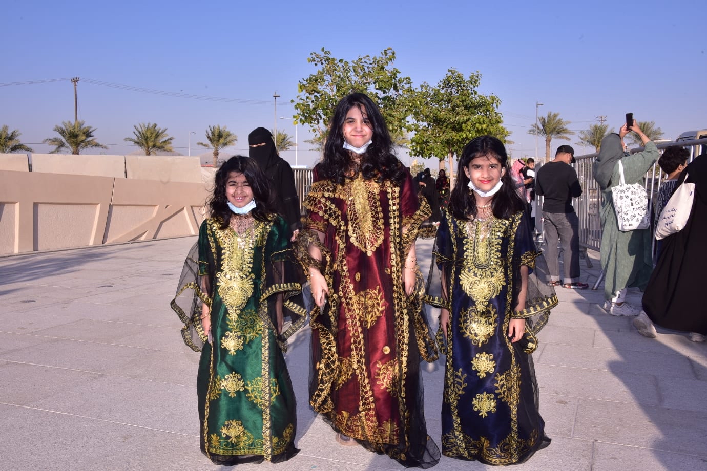 وظهر الزائرون على جنبات العرض من كبار وصغار بأزياء عائدة للمناطق بين العقال والدقلة من الوسطى ومعهم نساء بالبرقع و”الشيلة“ وأطفال ب ”البخنق“ فيما ارتدت فتيات وسيّدات من الشمال لباس ”المحوثل“، بينما كان هناك جموع ب ”الصمادة“ من الذكور وب ”السدرة“ من الإناث رمزاً للمنطقة الجنوبية، وارتدى أهالي الشرقية ”البشت“ للرجال و”النشل“ للنساء.