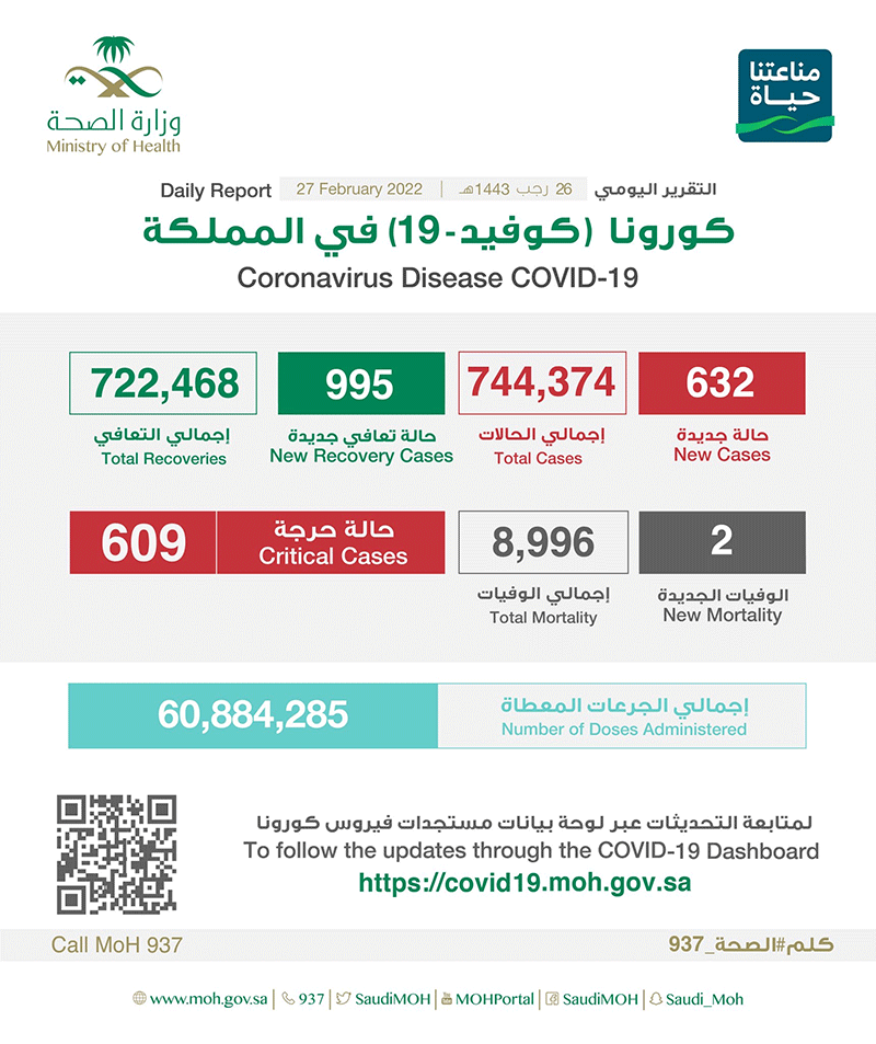 وتتيح وزارة الصحة الاطلاع على مستجدات الفايروس في المملكة، وذلك بنشر إحصاءاتها اليومية على الموقع الإلكتروني https://covid19.moh.gov.sa/.