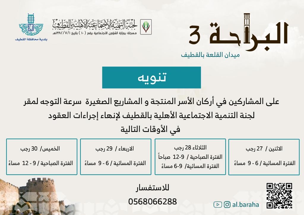 طالبت إدارة لجنة التنمية الاجتماعية الأهلية بالقطيف، المشاركين في مهرجان ”البراحة 3“، بسرعة التوجه لإنهاء إجراءات العقود.