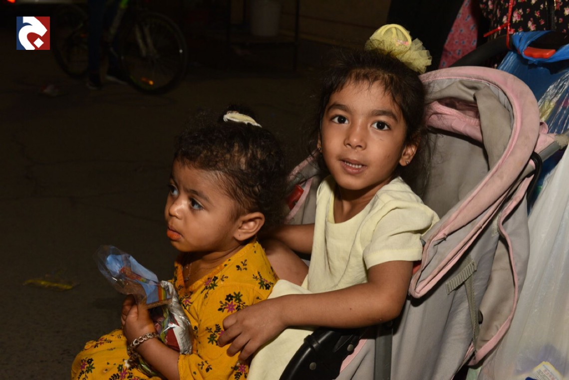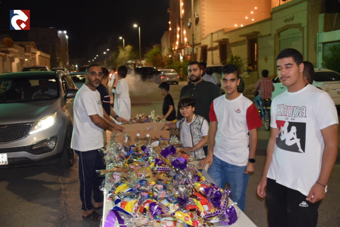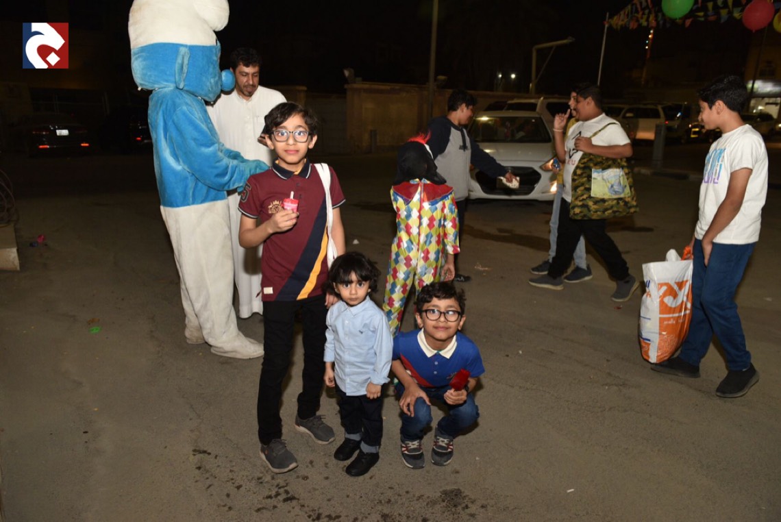 وانتشر الأطفال المتزينين بالثياب الخاصة بالقرقيعان وهم يحملون الأكياس مارين بمنازل الأقارب والجيران لجمع الهدايا والحلويات وهم يرددون بصوت مسموع ”ناصفة حلاوة أعطونا الله يعطيكم“.